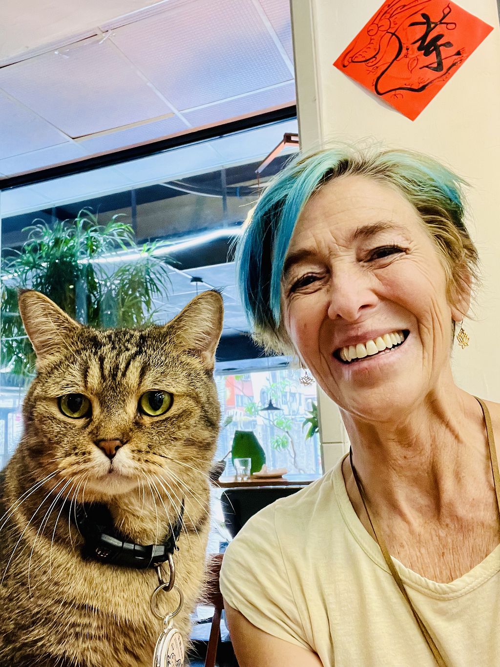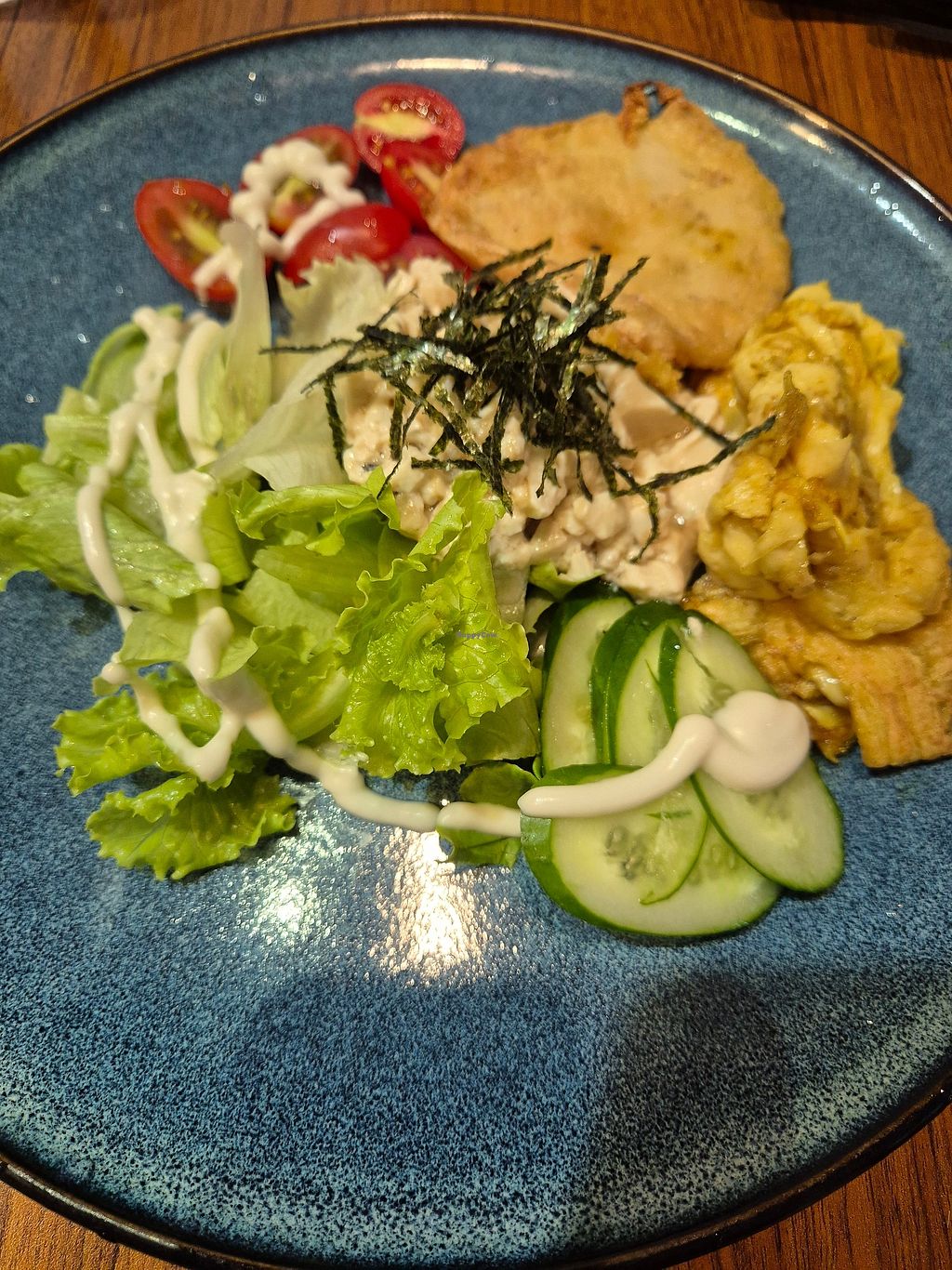 My family and I had a very pleasant time eating dinner and getting haircuts in this very comfortable and relaxed vegan restaurant. The taiwanese oyster omelette was delicious, much better than the “real” version. The warm tofu salad was also delicious, the use of tofu skin for egg was quite satisfying. Extra bonus for having a friendly cat at the shop as well.