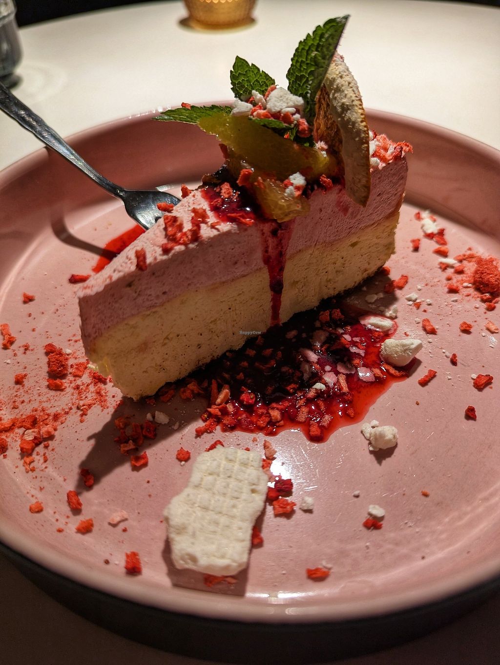 The food is amazing! There is a lot of variety and everything was absolutely delicious. We tried the BBQ Skewer and the Breaded 'Chicken' on he first day and the second time we visited we had the Tomato and Bell pepper puree soup and Beetroot Ravioli. Although some of these dishes were 'lighter' dishes we didn't leave hungry. Maybe because we had some cake as a desert which were amazing too! We ordered cake from the display and not from the menu - so I can't say anything about this. But I am sure every cake they offer you is tasty as well!