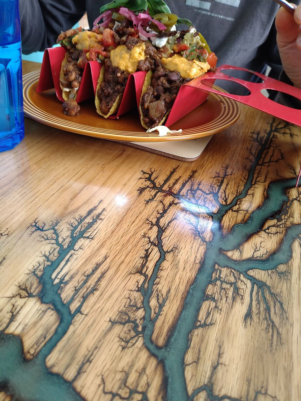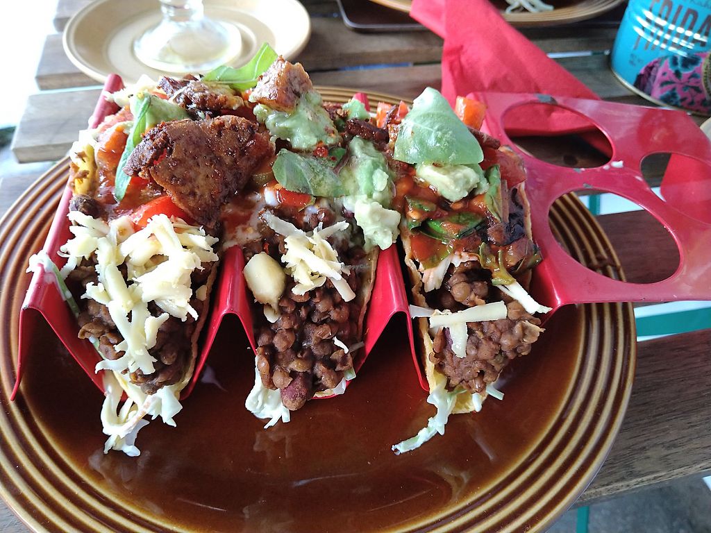 Beany chilli tacos with a cashew cheese sauce. Bottom layer is salad aβ¦