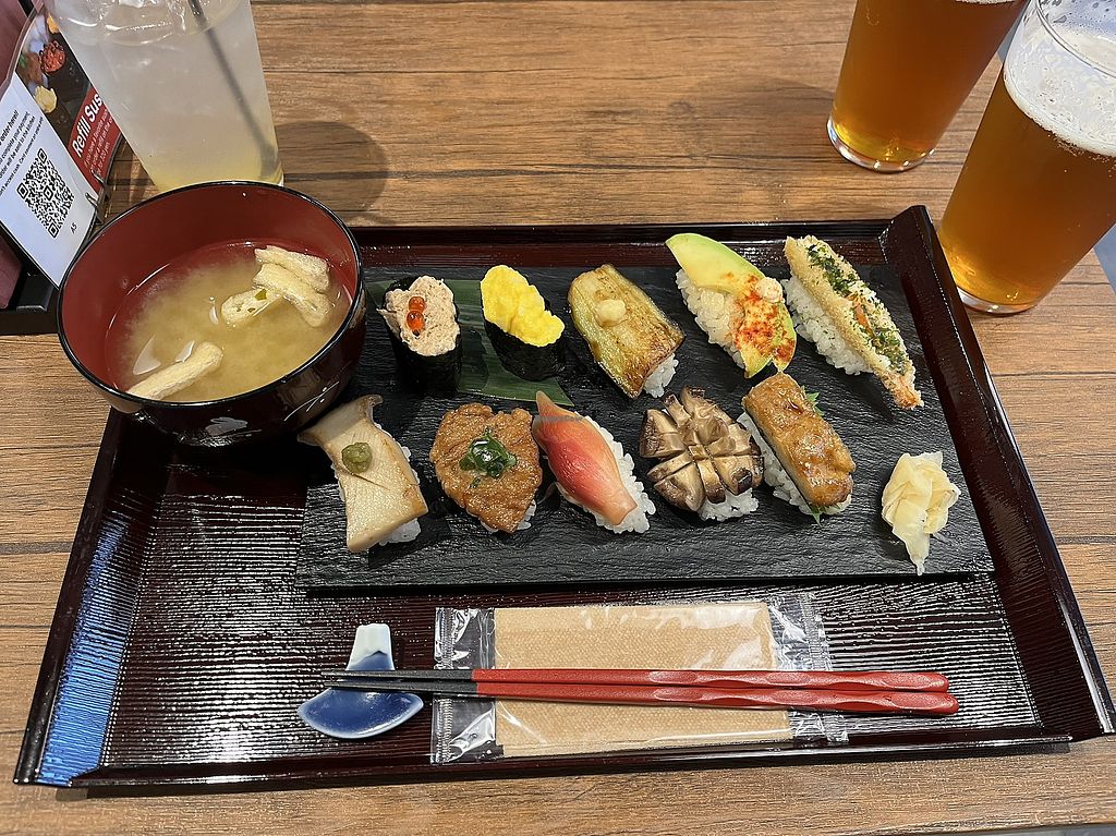 Vegan sushi sold as set plates. Sushi was tasty, especially the Japanese ginger, tempura, shiitake mushroom, scrambled egg, and tuna rolls were delicious. The dorayaki, ice cream and donut were okay. The yuzu soda was refreshing.