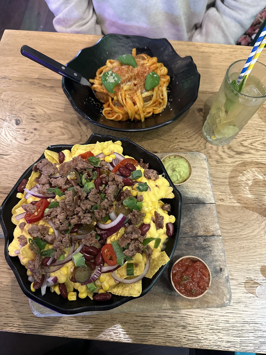 Cute atmosphere, good throwback music, our waiter was kind and knowledgeable, I got nachos with beyond meat and my partner got the pasta with meatballs. Both meals were okay vegan meals, not much flavor but okay! The desserts were very delicious- Dutch apple pie and chocolate mousse.