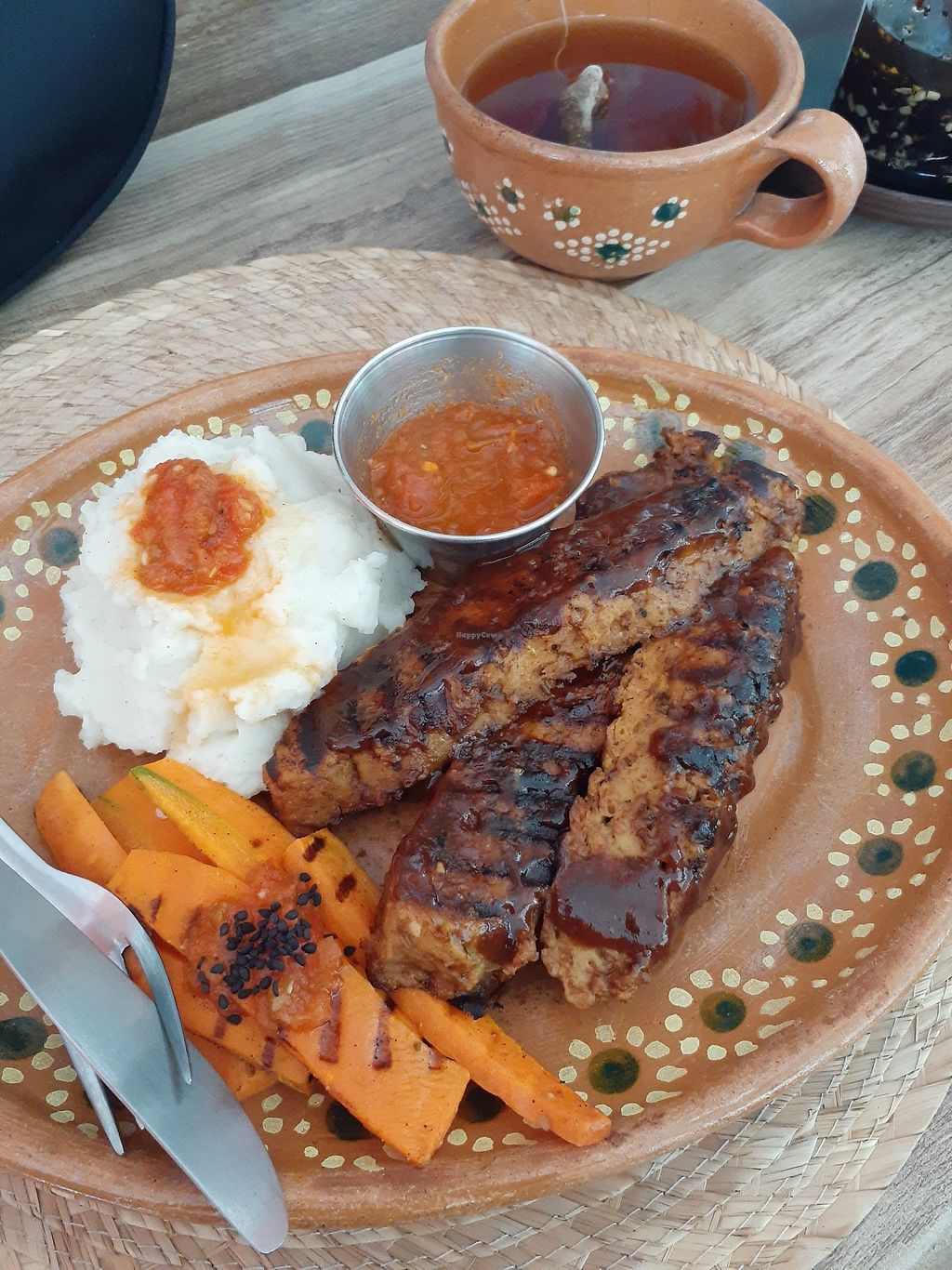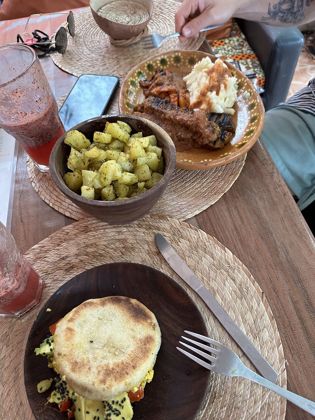 The home made pita bread that one of the owners Viri makes is so delicious. I also recommend buying her Holy Berry salsa she makes from scratch, it has olive oil, sunflower seeds, and habanero peppers! I would say my favorite items include; Monkey rush and alkaline human detox for beverages. Sandwich Vegano, Jalepeno mac & Cheese, and the Sticky Vegan Ribs are my favorite meals. Ok its all amazing! Now they have vegan desserts too!