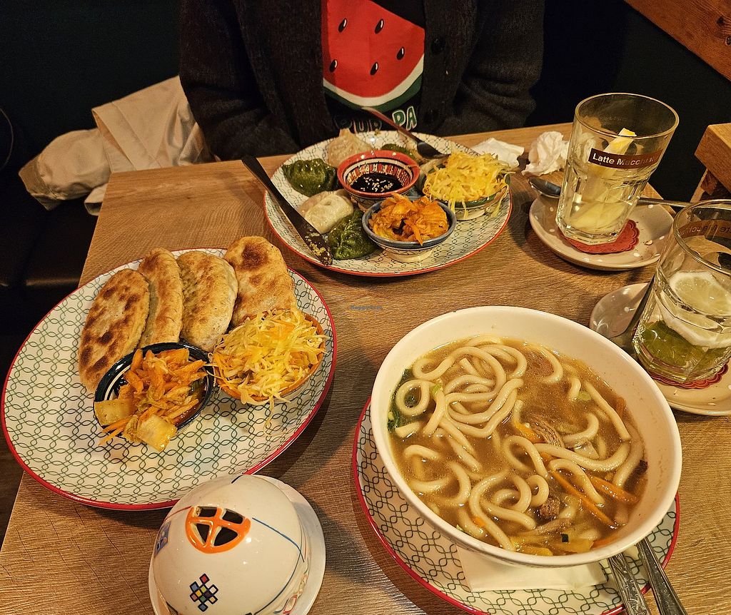 Udon soup and plates of fried and steamed dumplings.