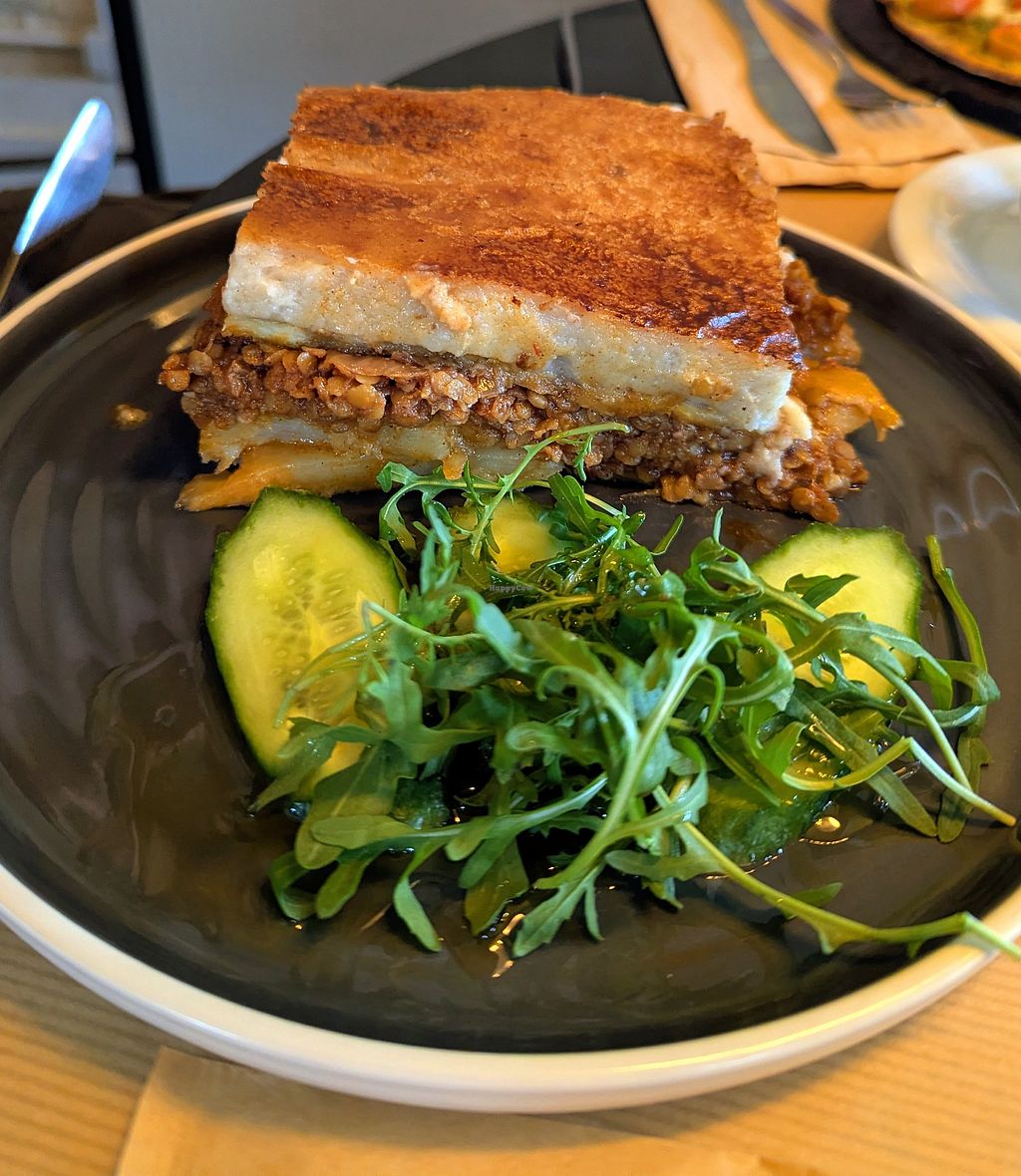 We went here for lunch, and were immediately impressed with the lovely light dining area, with high ceilings and windows. The menu is extensive and it was difficult to narrow down our choices! In the end we had tempeh souvlaki, with the tempeh well-flavoured and cooked, and a delicious pink sauce; pesto pizza, with an amazing cashew feta; moussaka made with beautifully seasoned lentils; pesto pasta, with an amazing creamy pesto and a flavourful cashew-nooch parm; and a club sandwich with a great smoked tofu, lovely red vegetable sauce and mayo, and with lovely chunky skin-on fries. I also had a refreshing "white" smoothie. All in all: amazing food, great atmosphere (the music featured covers of well-known songs and most of them were better than the originals!), and sweet, welcoming people. Highly recommended!