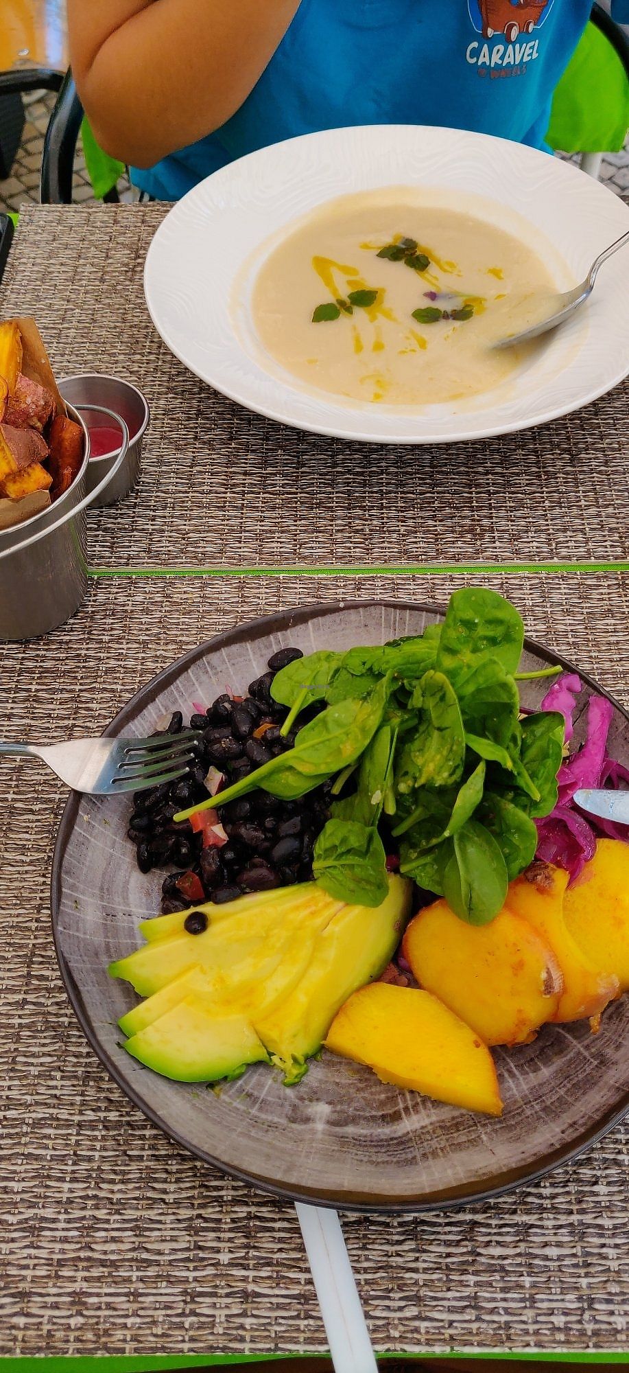 Potato roll, sauces (e.g. shredded coconut) and soup