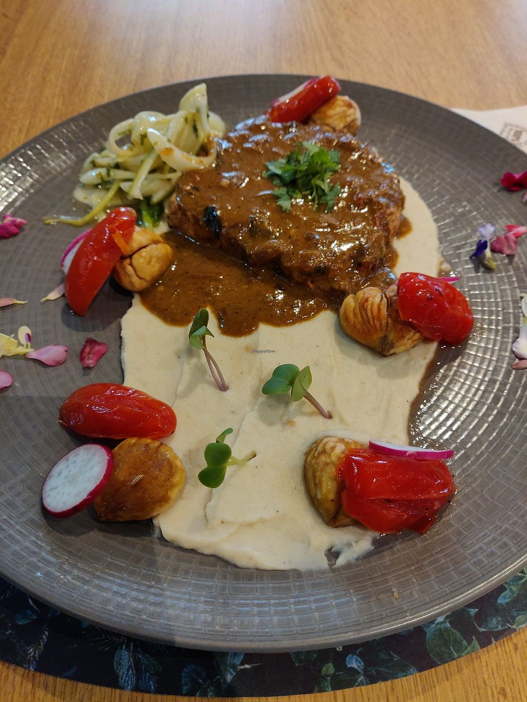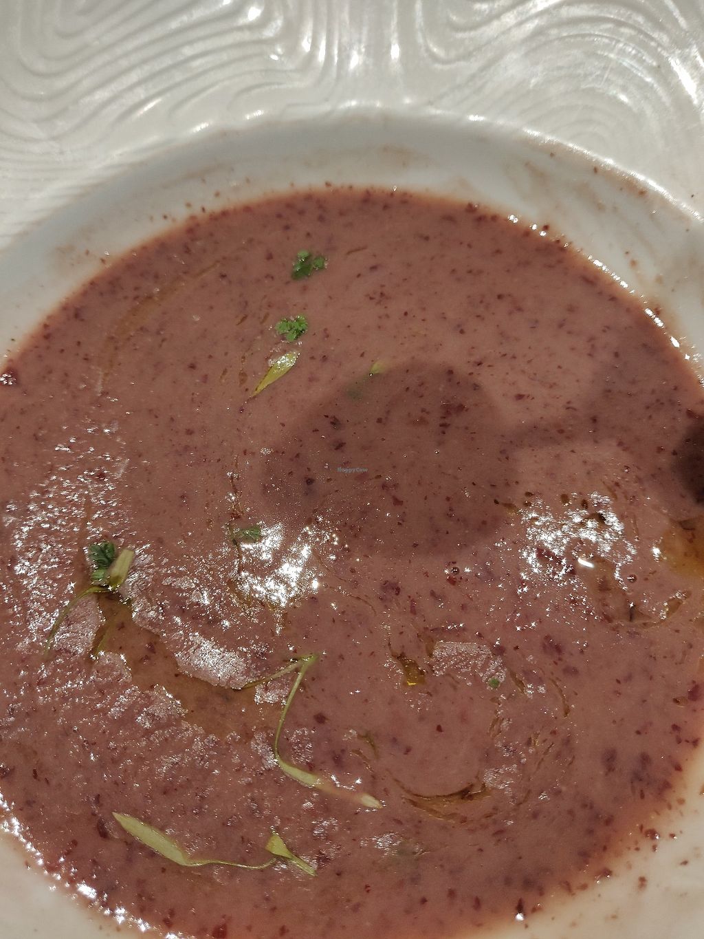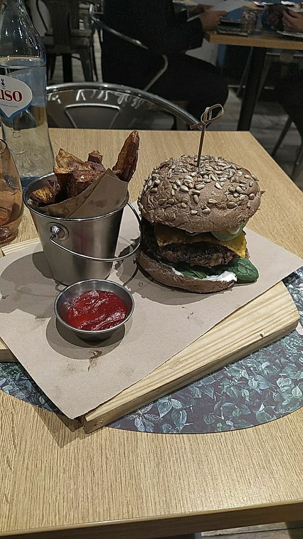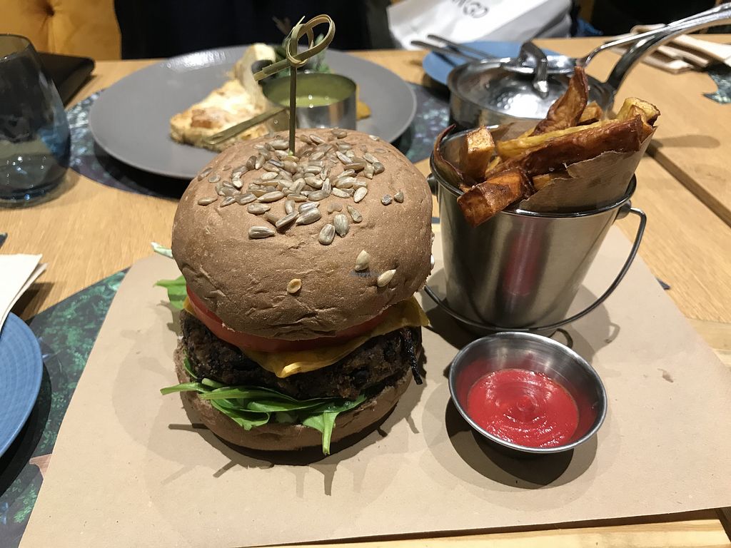 Brownie Burger with sweet potato fries and beetroot ketchup