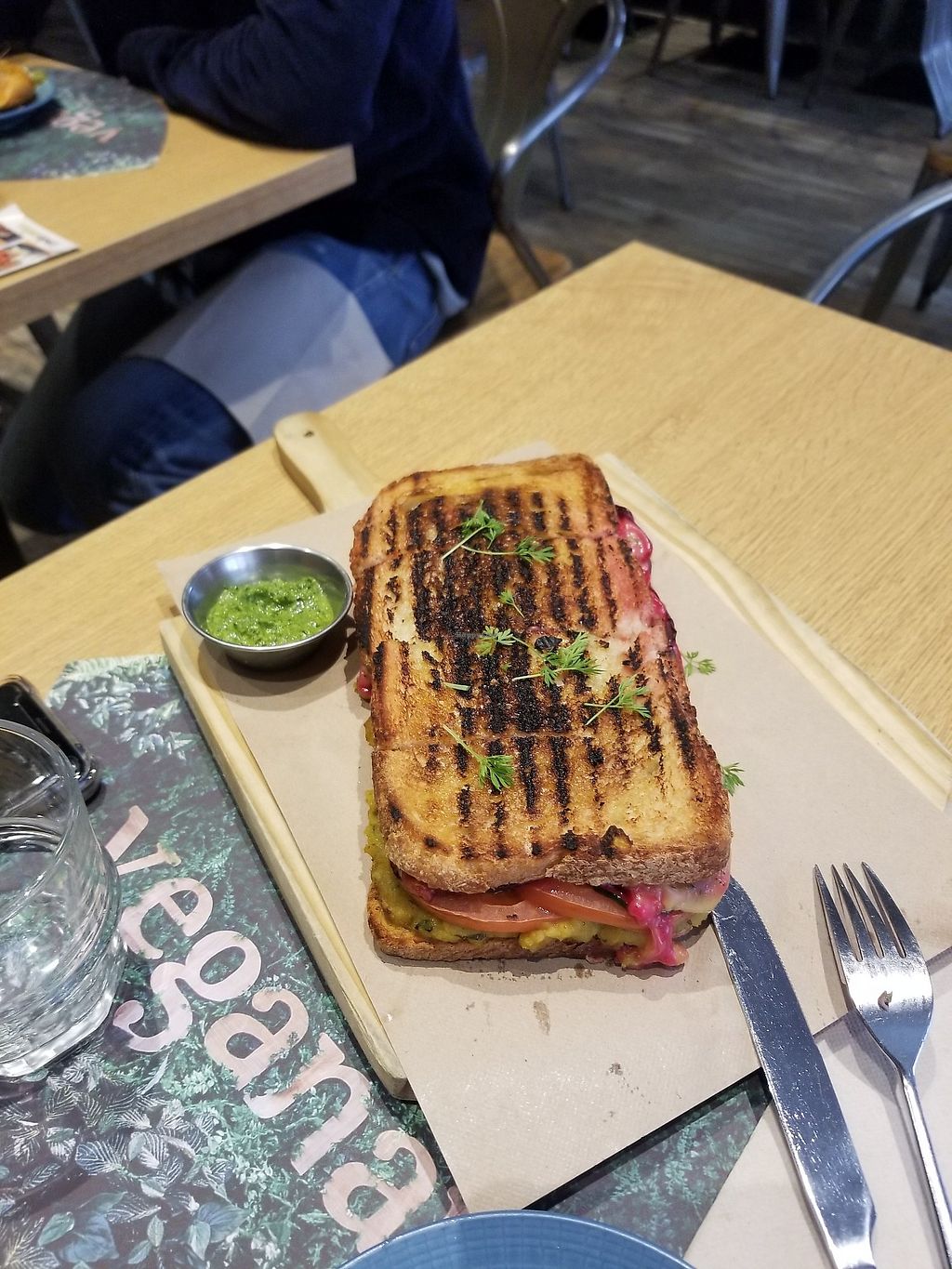 Scrambled tofu with vegan sausage, beans, mushrooms, tomatoes and brea…