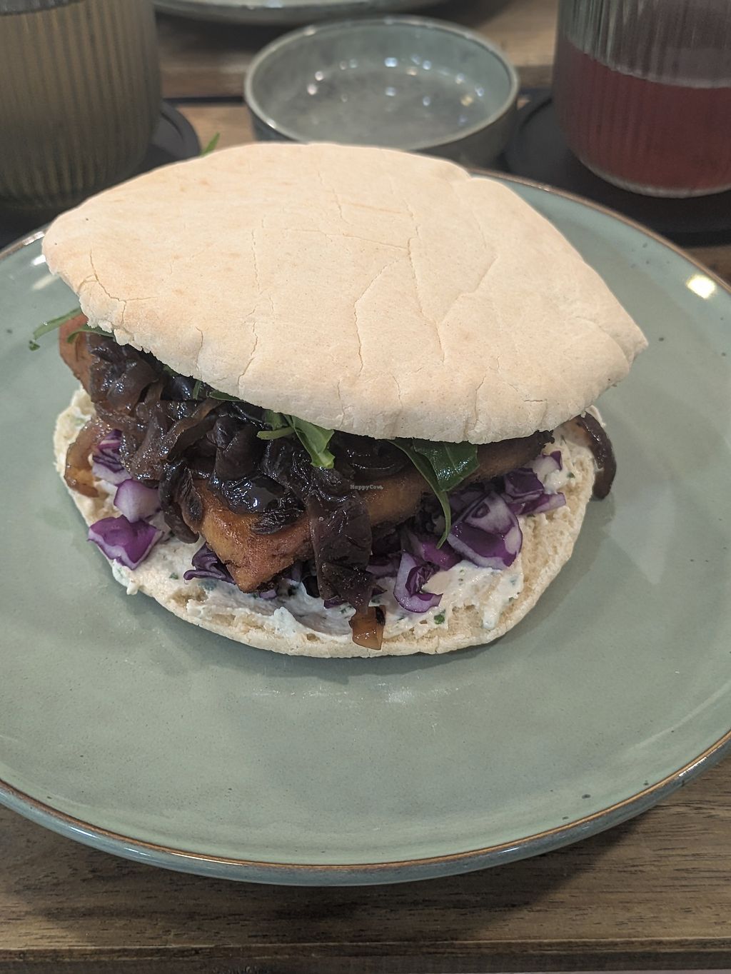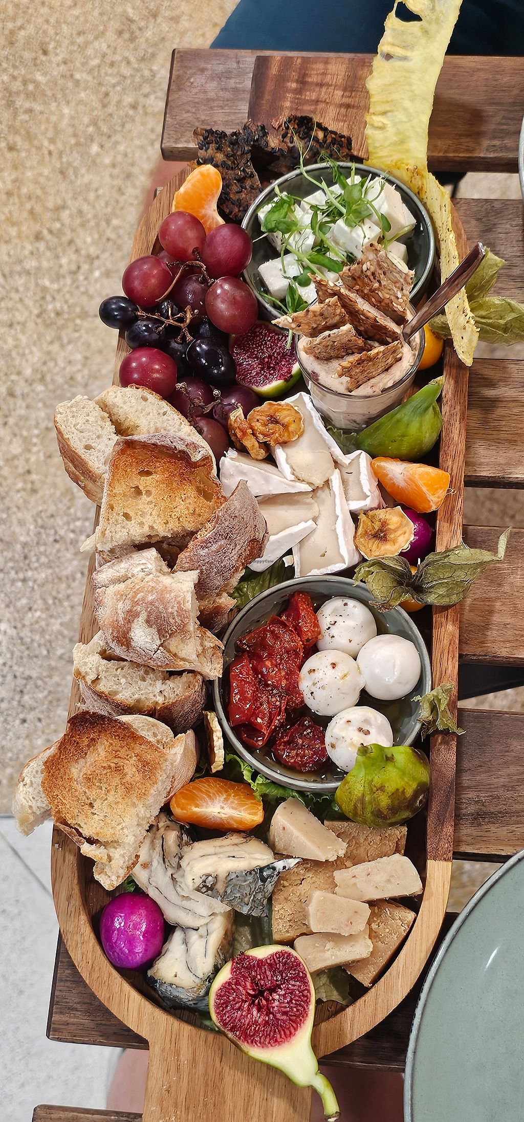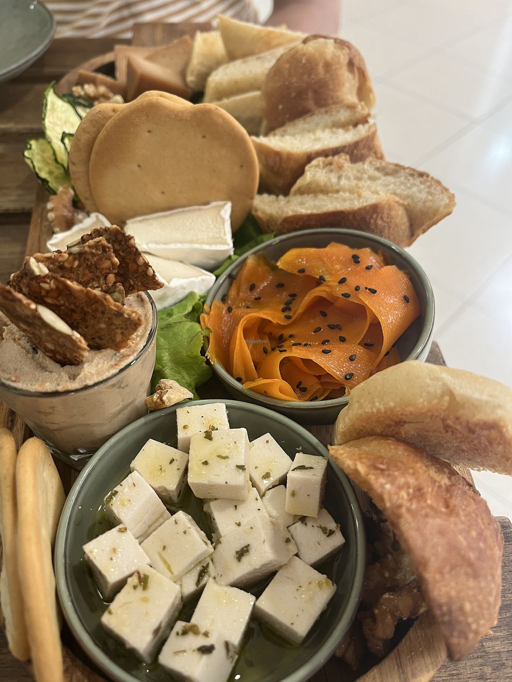 We tried the 5-cheese board (feta, Camembert, mozzarella, cream cheese, and peppercorn) and also their 2-day marinated tofu pitta pocket. All were perfect.