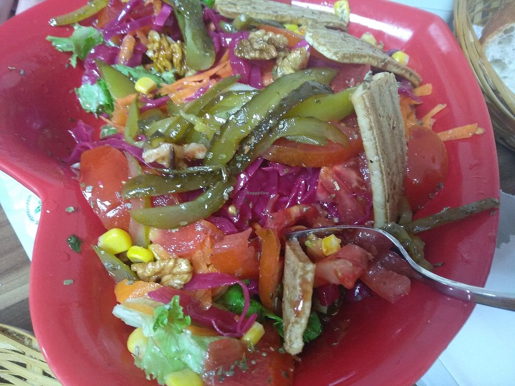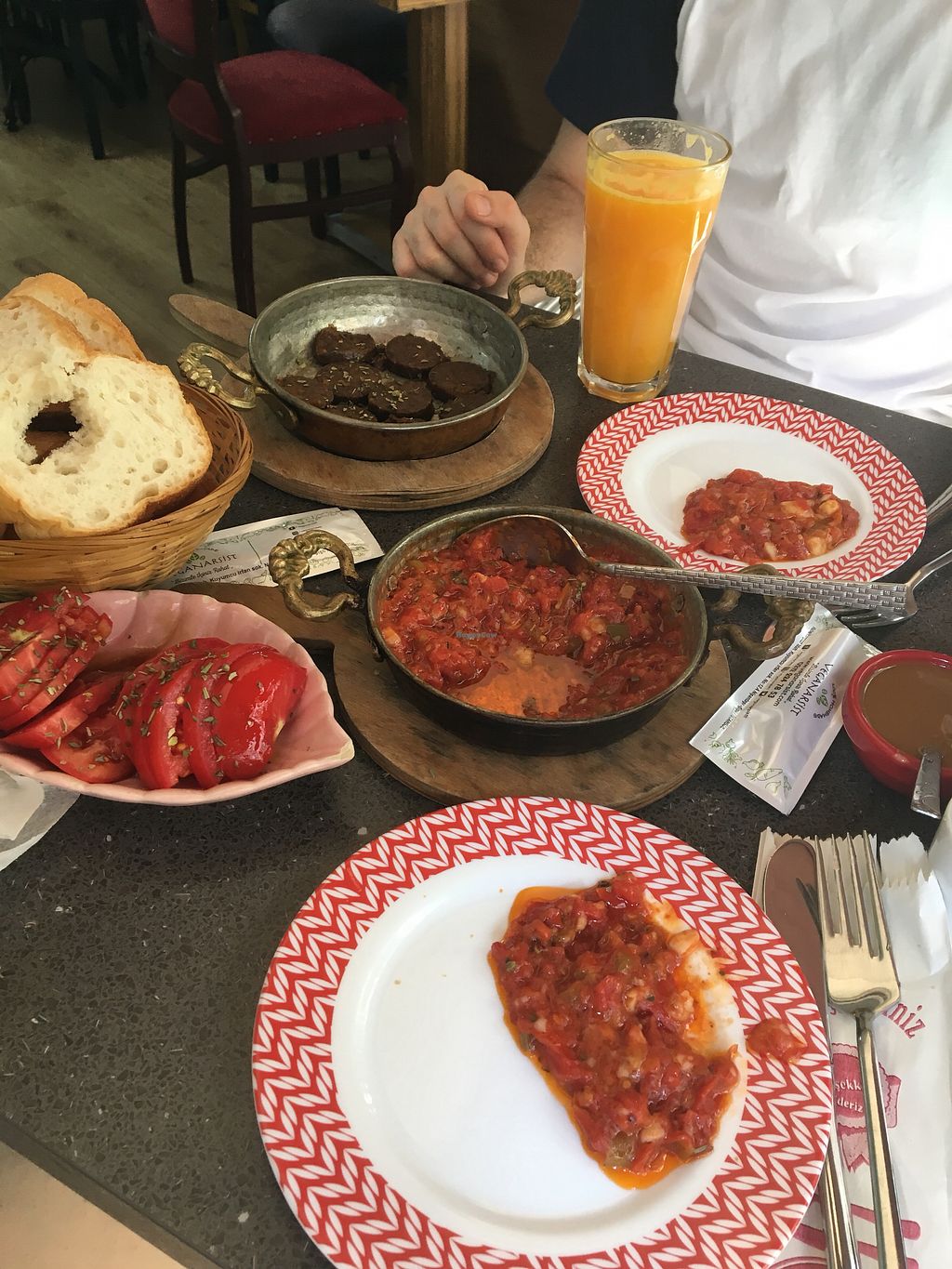 Vegan sucuk, peynirli menemen, tahin pekmez, söğüş domates