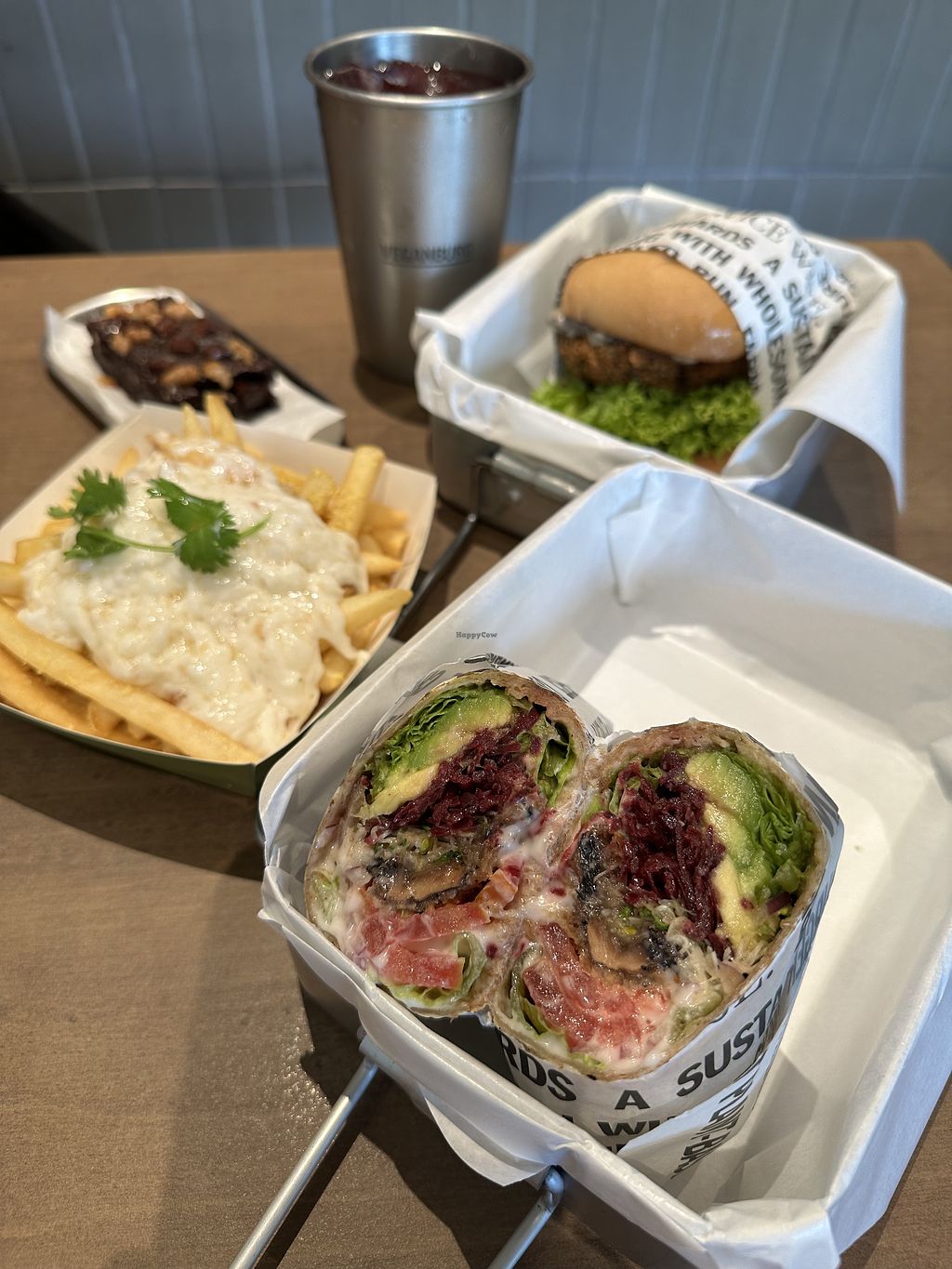 Vegan burger restaurant est. 2010. Menu offers a variety of burgers in addition to fries, sides, soup, soft service ice cream, and drinks. Aside from the Impossible burger, burger patties are made from non-gmo soybean and mushrooms and buns with seeds and walnuts. Online ordering available. Cashless. Halal certified March 2024. Open Mon-Thu 11:30am-9:30pm, Fri-Sun 11:30am-10:00pm.