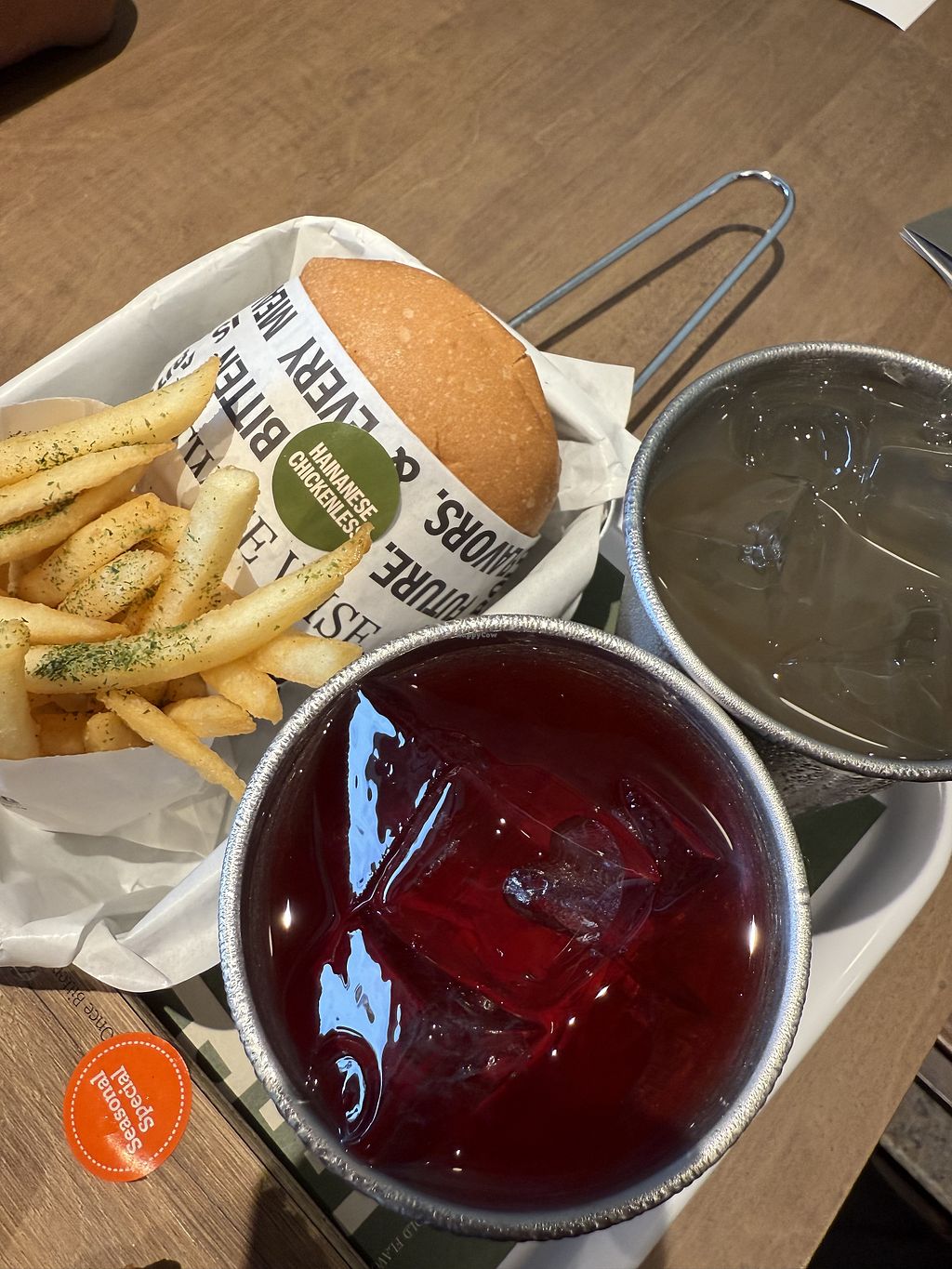 The burgers we had were tasty. The haianese chicken and smokey bbq are tasty but you are left wondering if they're really worth the money. The haianese chicken is very spicy. The seaweed fries are nice although they don't taste like seaweed at all. It's sad that they have only a small selection of drinks to go with the burgers. All in all recommendable. The reusable containers are commendable and straws are avoided.