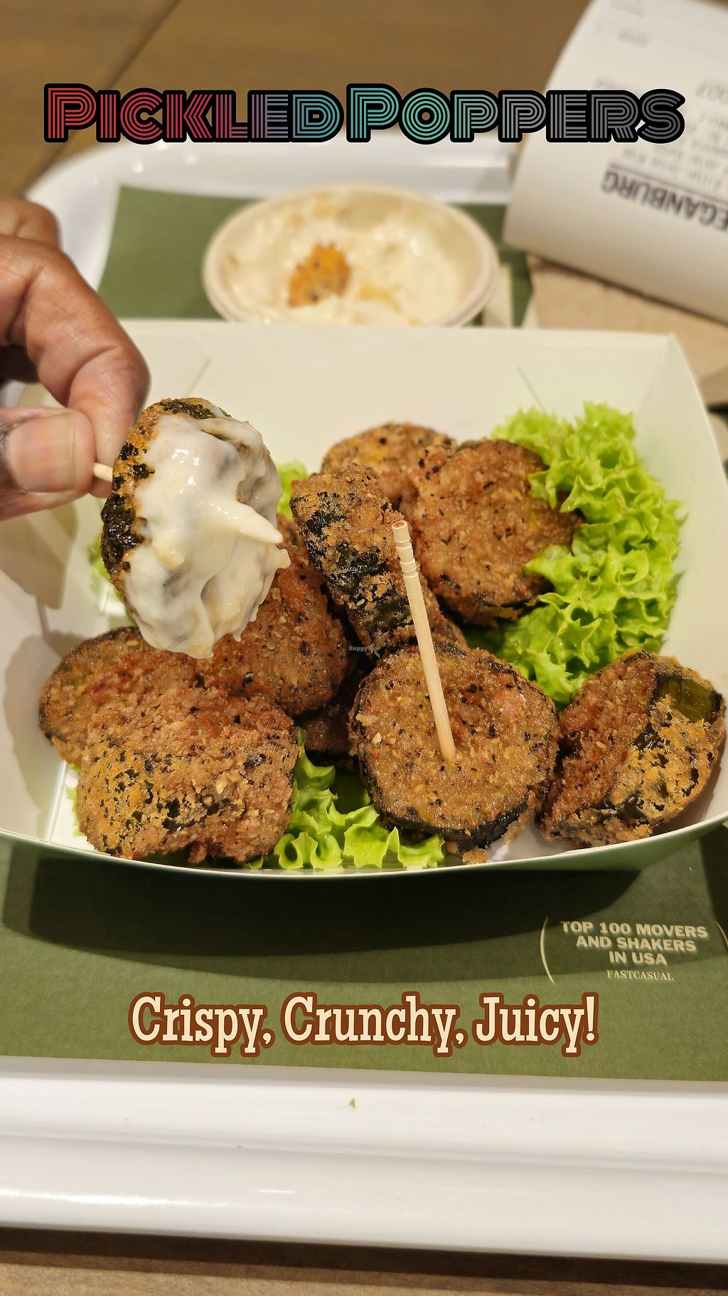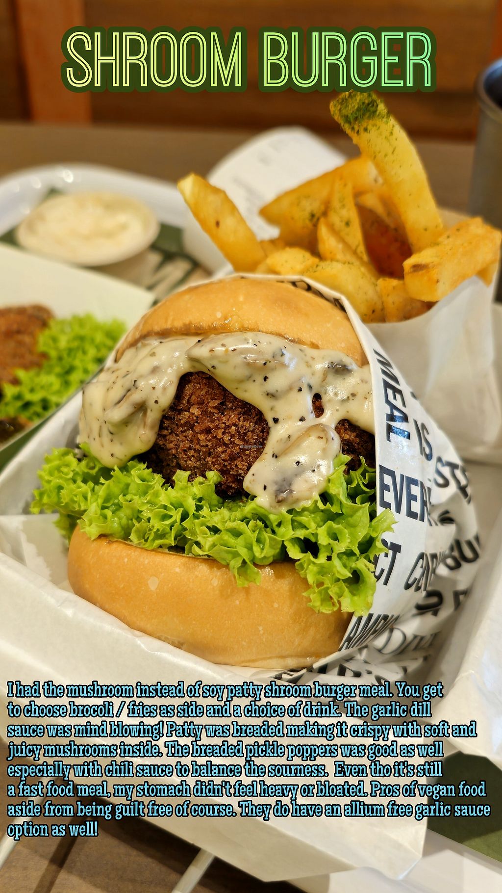 I had the mushroom instead of soy patty shroom burger meal. You get to choose brocoli / fries as side and a choice of drink. The garlic dill sauce was mind blowing! Patty was breaded making it so crispy with soft and juicy mushrooms inside. The breaded pickle poppers was good as well especially with chili sauce to balance the sourness. Even tho it's still fast food, my stomach didn't feel heavy or bloated. Pros of vegan food aside from being guilt free of course. They do have an allium free garlic sauce option as well!