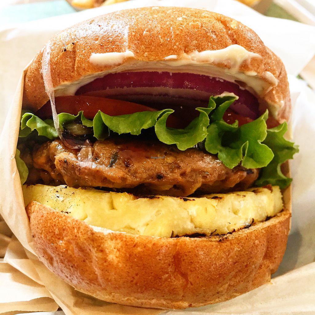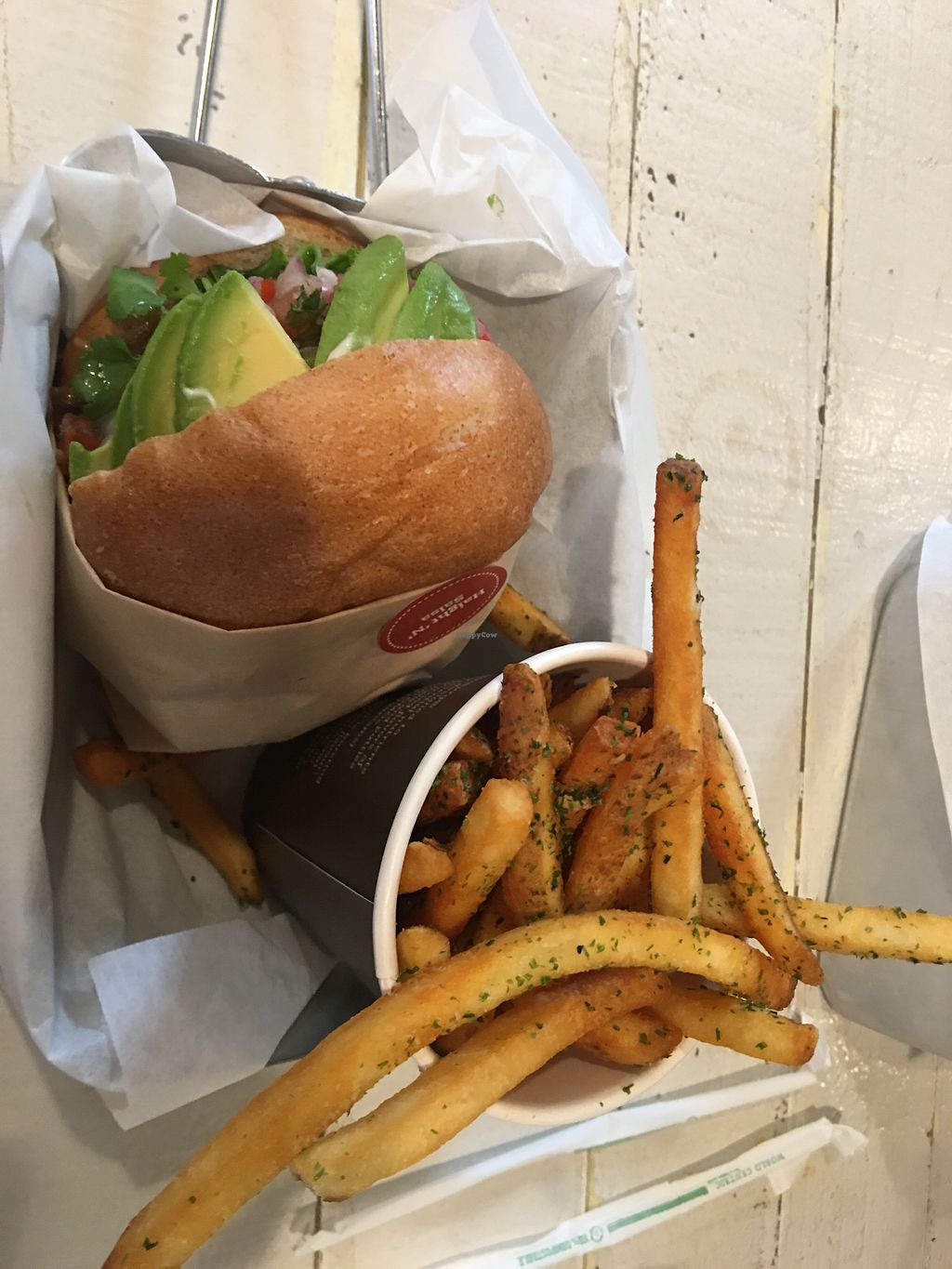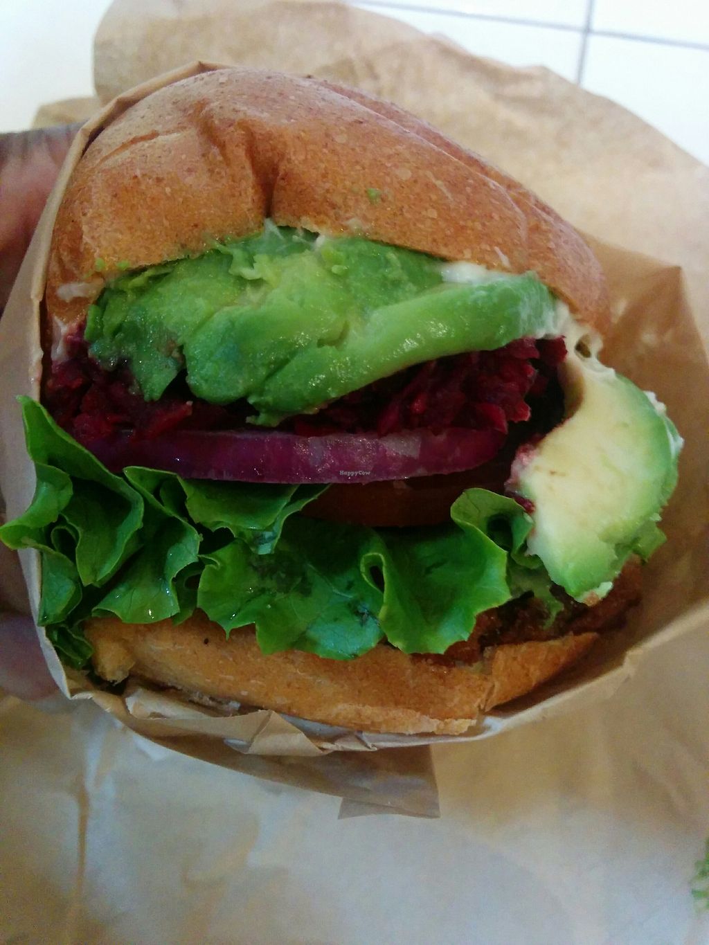 Avocado beetroot burger; crisp GMO free plant protein patty topped wit…