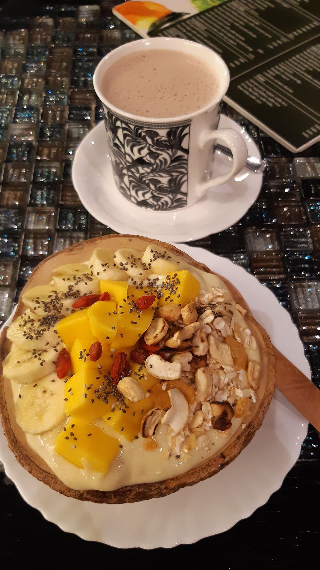 Smoothie bowl and hot cacao reishi