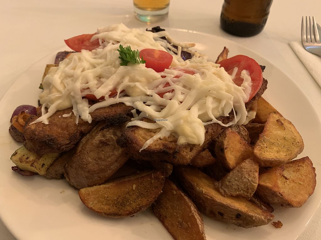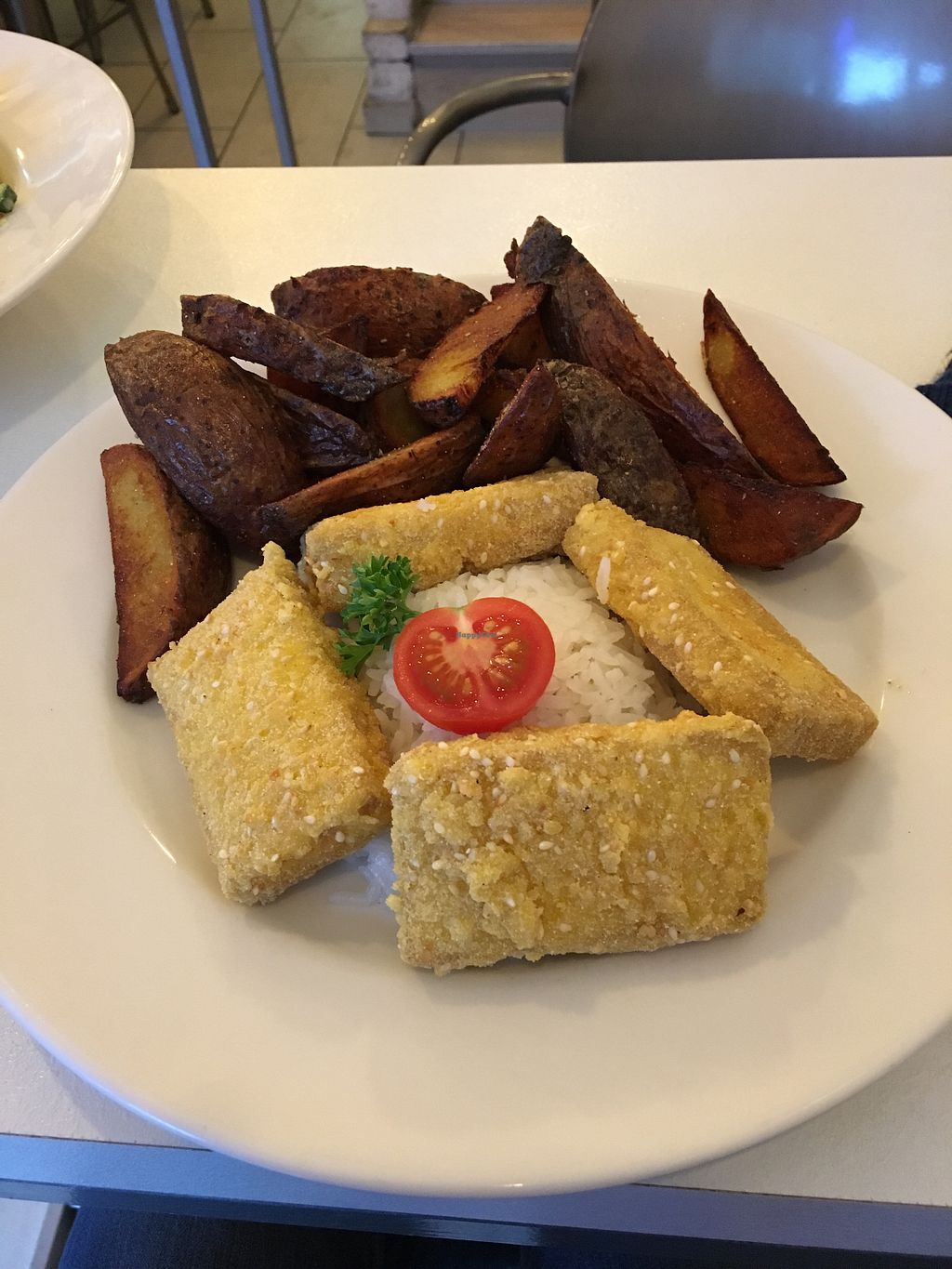 Top: fried seitan in corn jackets, with steak potatoes and spicy sauceโฆ