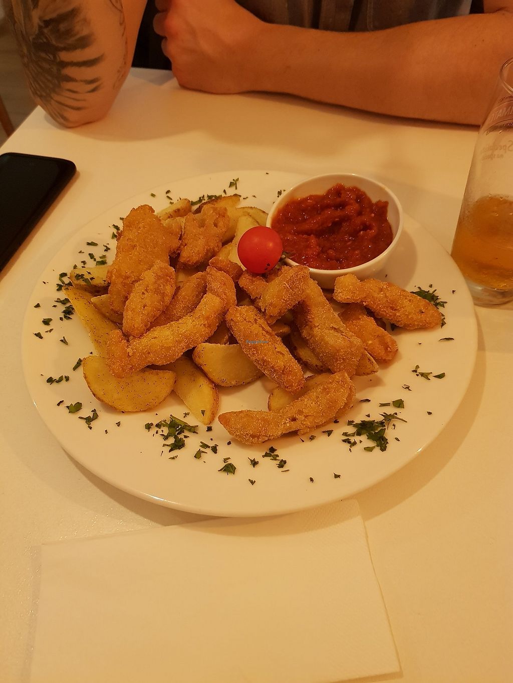 Fried seitan in cornjackets with steak potatoes and spicy sauce
