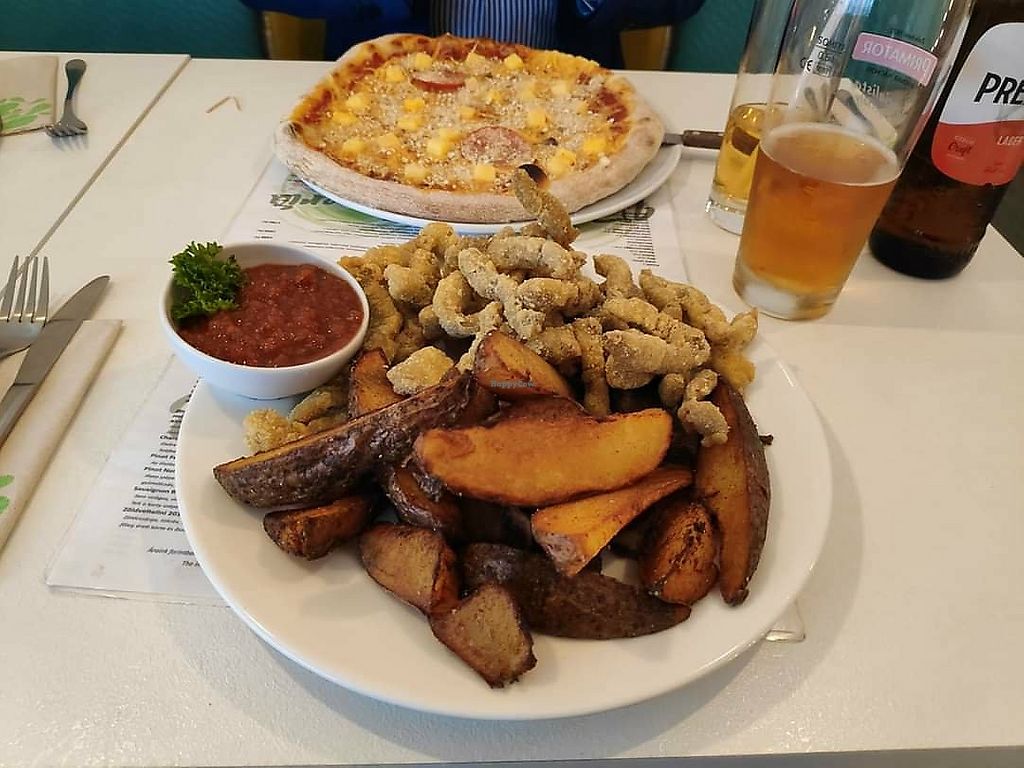 Seitan with potatoes, and a vegan pizza for a friend