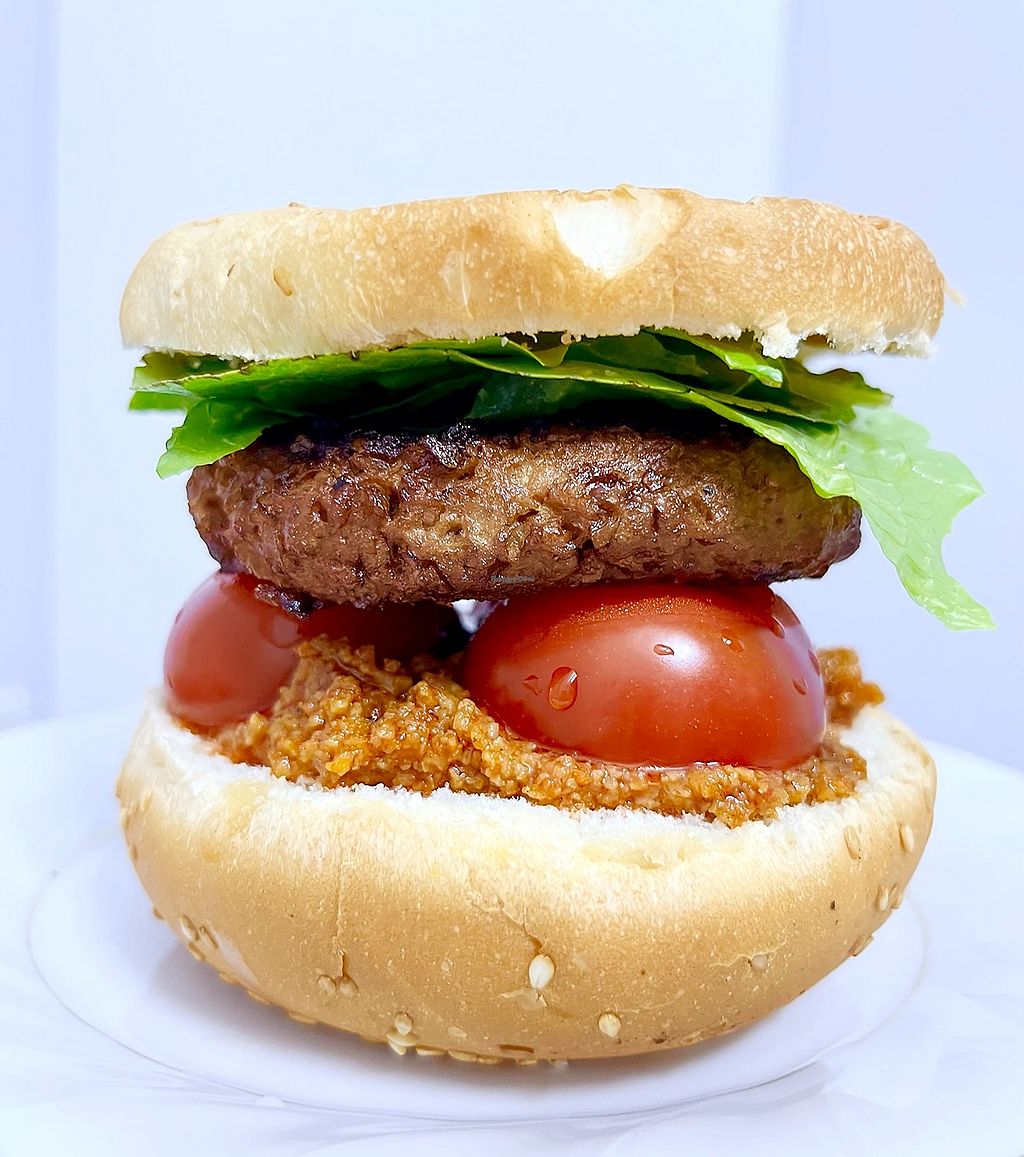 Homemade vegan burger made with vegan "Bite" cutlet that had been boug…
