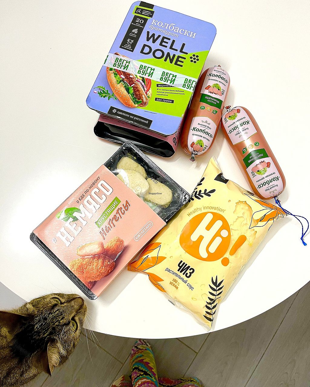 Vegan sausages, nuggets, "ham" sausage and "cheese" sauce