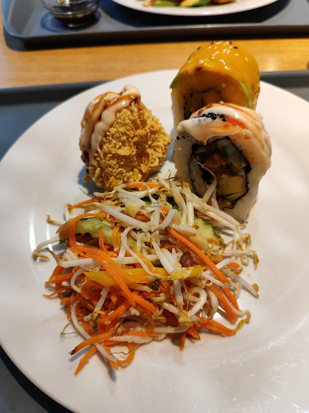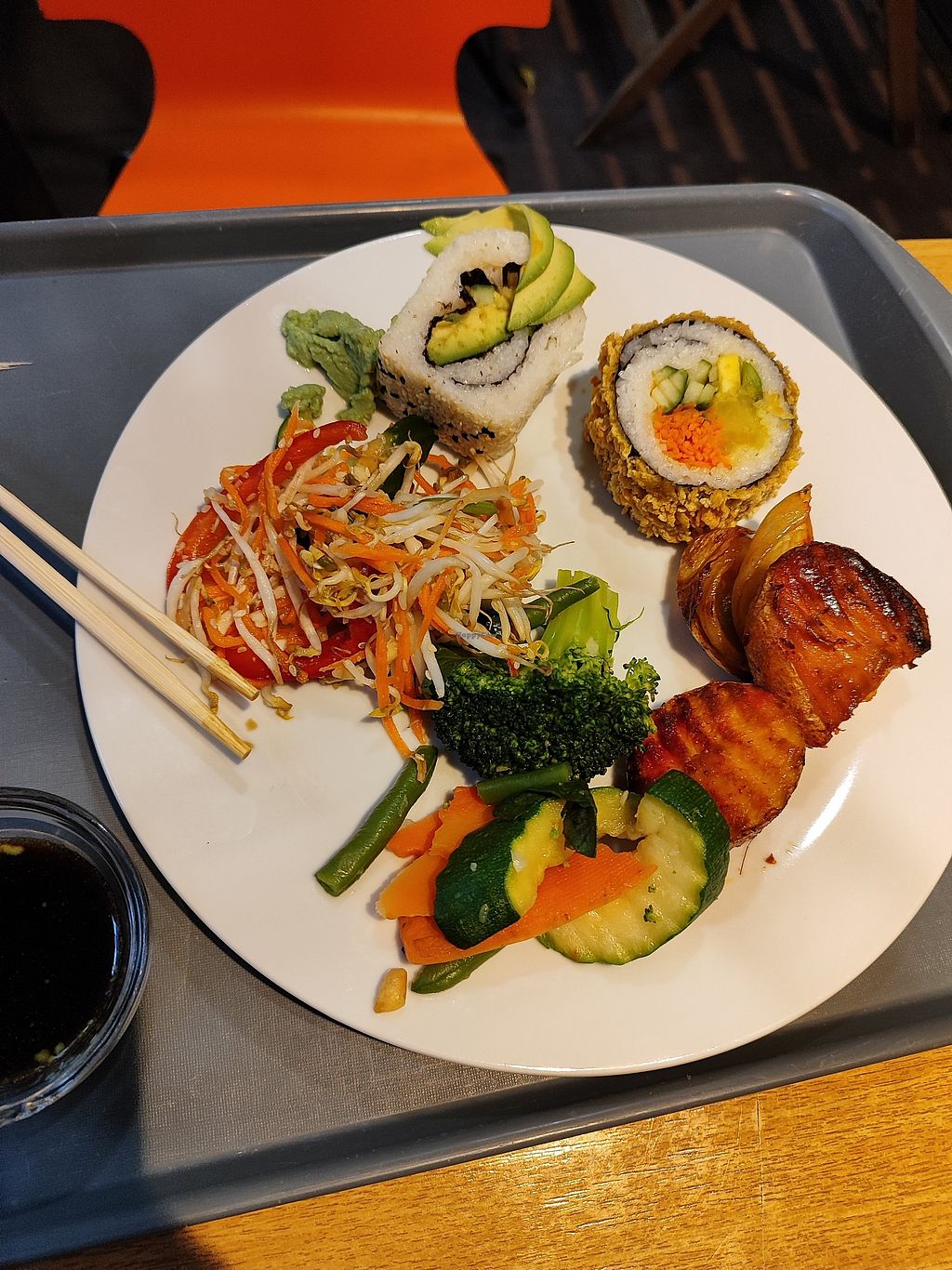 Very wide choice, from buffet to salads and burgers. Lot of cakes and ice creams plus packed food. Lot of pretty vegan sushi. Very nice service from the lady at the counter.