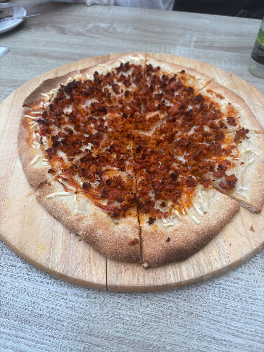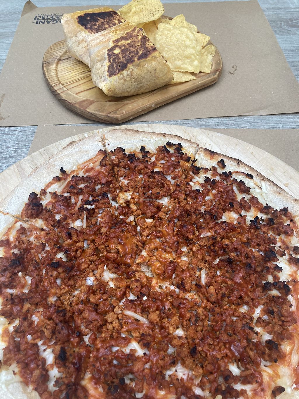 Vegan food with substance! After eating a lot of veggie tapas , Veganitessen had some great options with more filling protein. We got the the spicy chori pizza and the burrito. Both were very good, but could have used a sauce to pair with. The pizza dough is more cracker like, but still quite good. Would recommend!