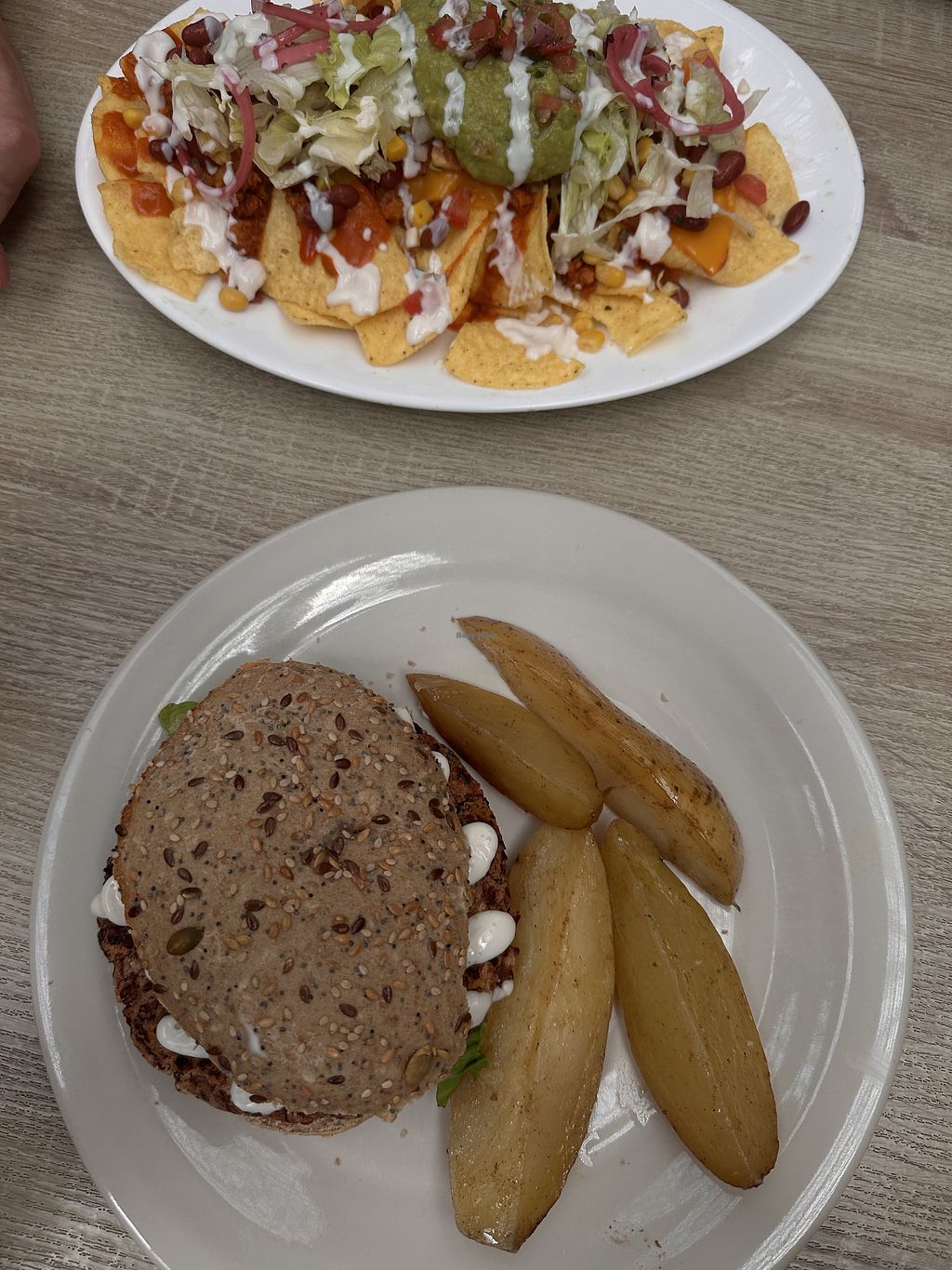 Vegan bean burger and nachos