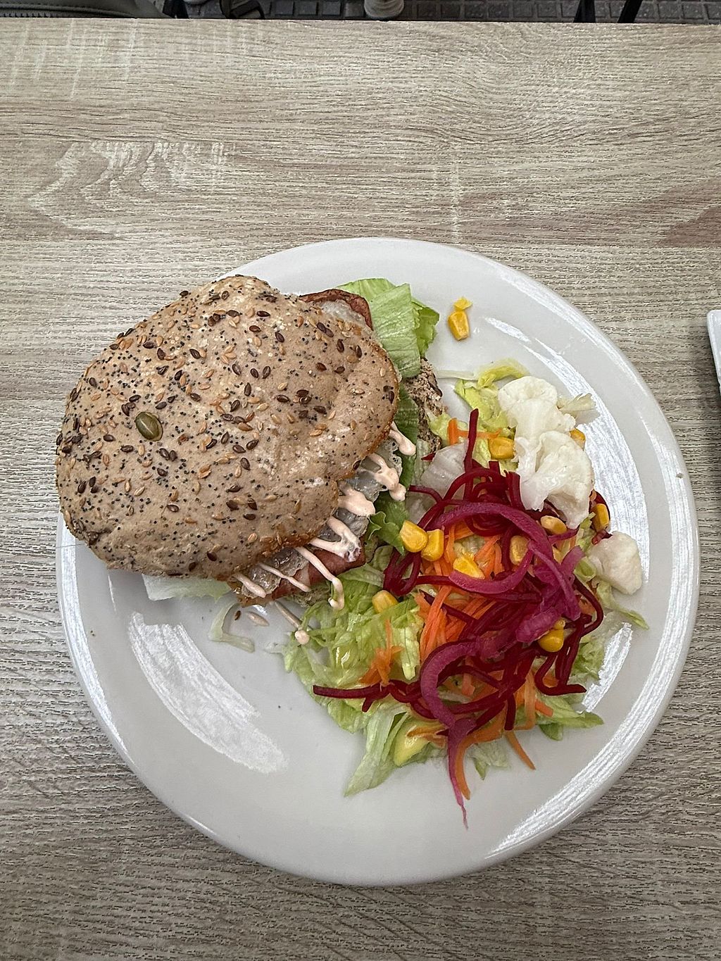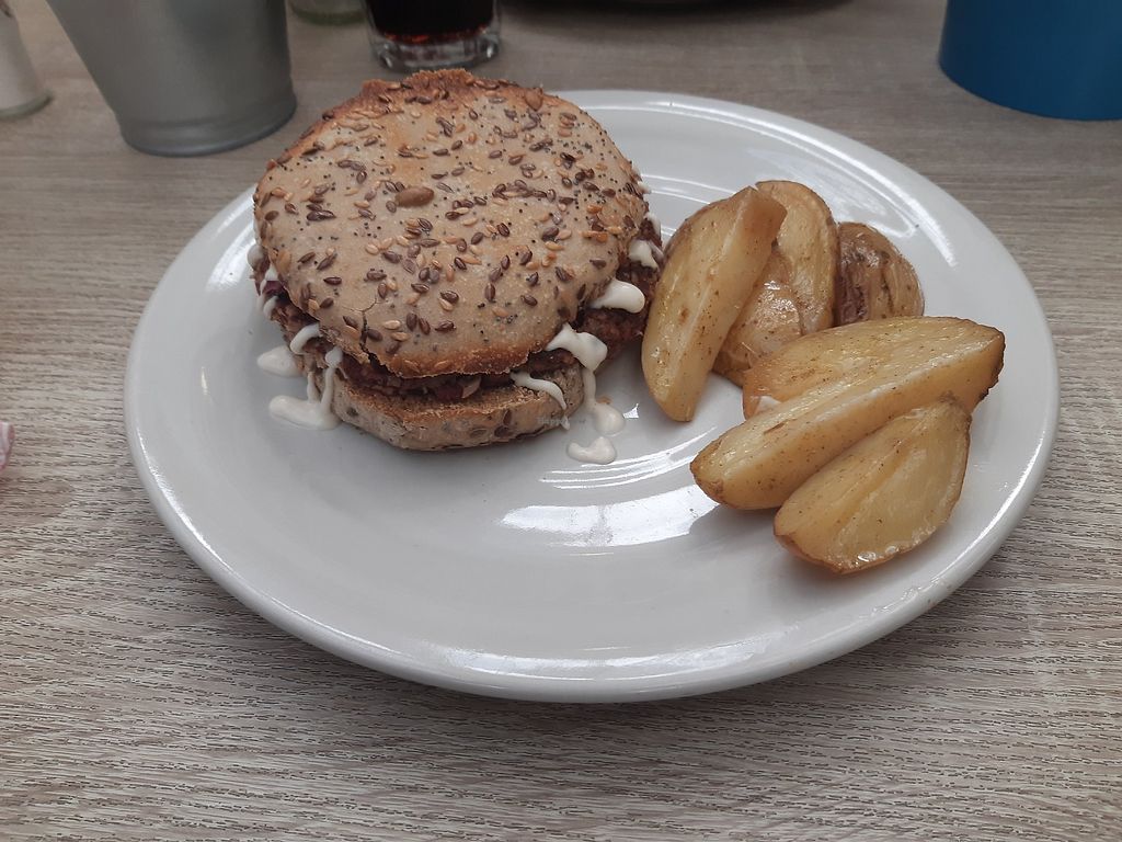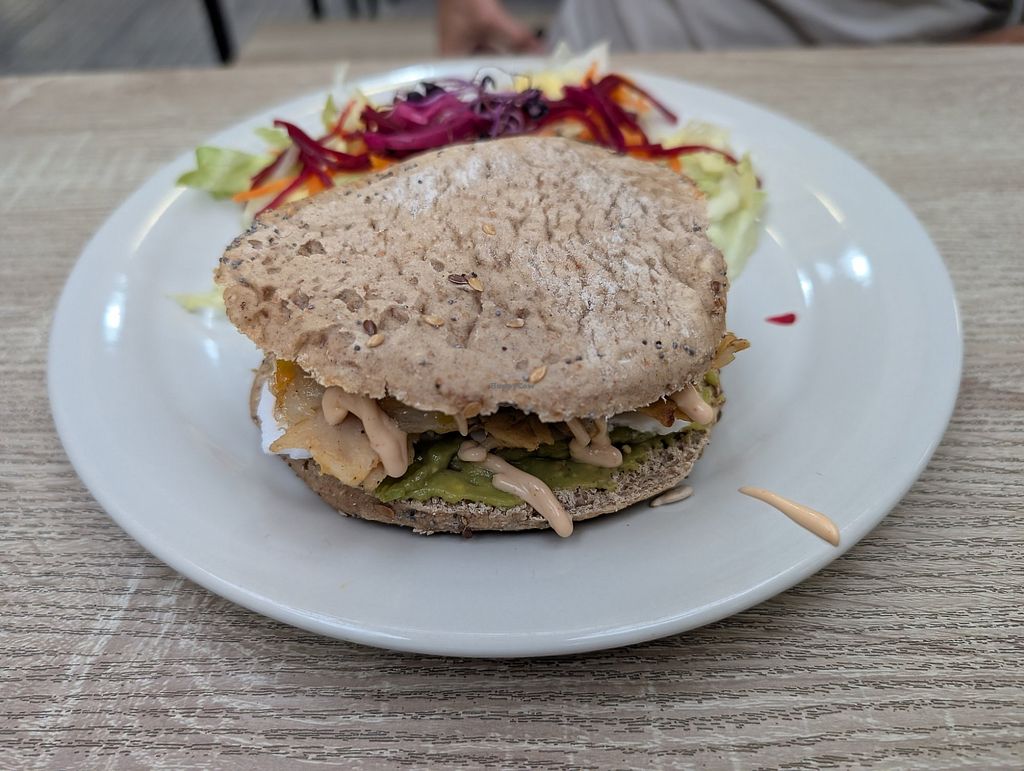 Hamburguesa de huevo y bacon pero con pan de semillas