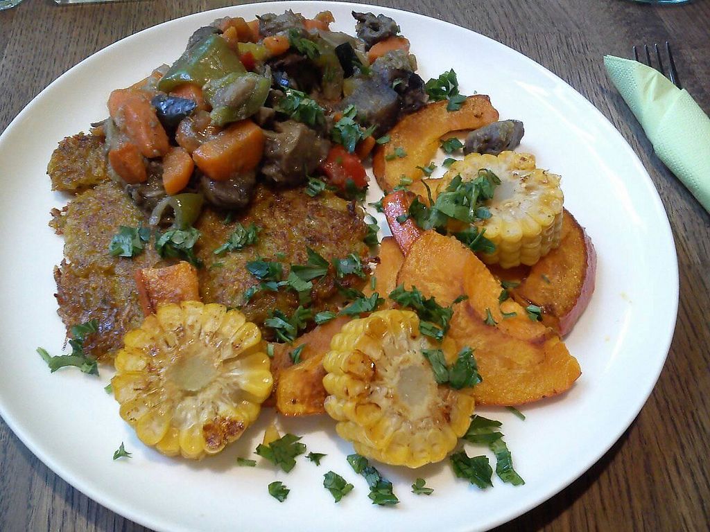 potato and carrot flat cakes with corn pumpkin and veggies
