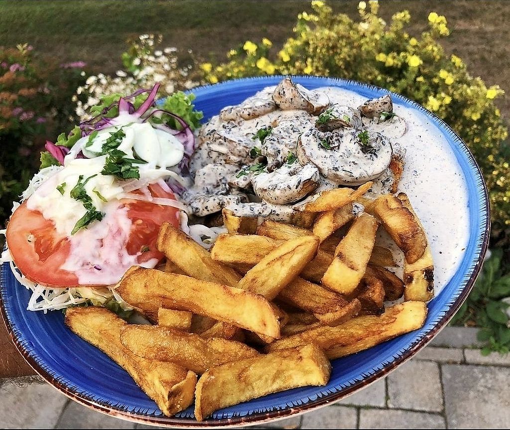 Bowl mit Rostzwiebeln / Reis und Gyros