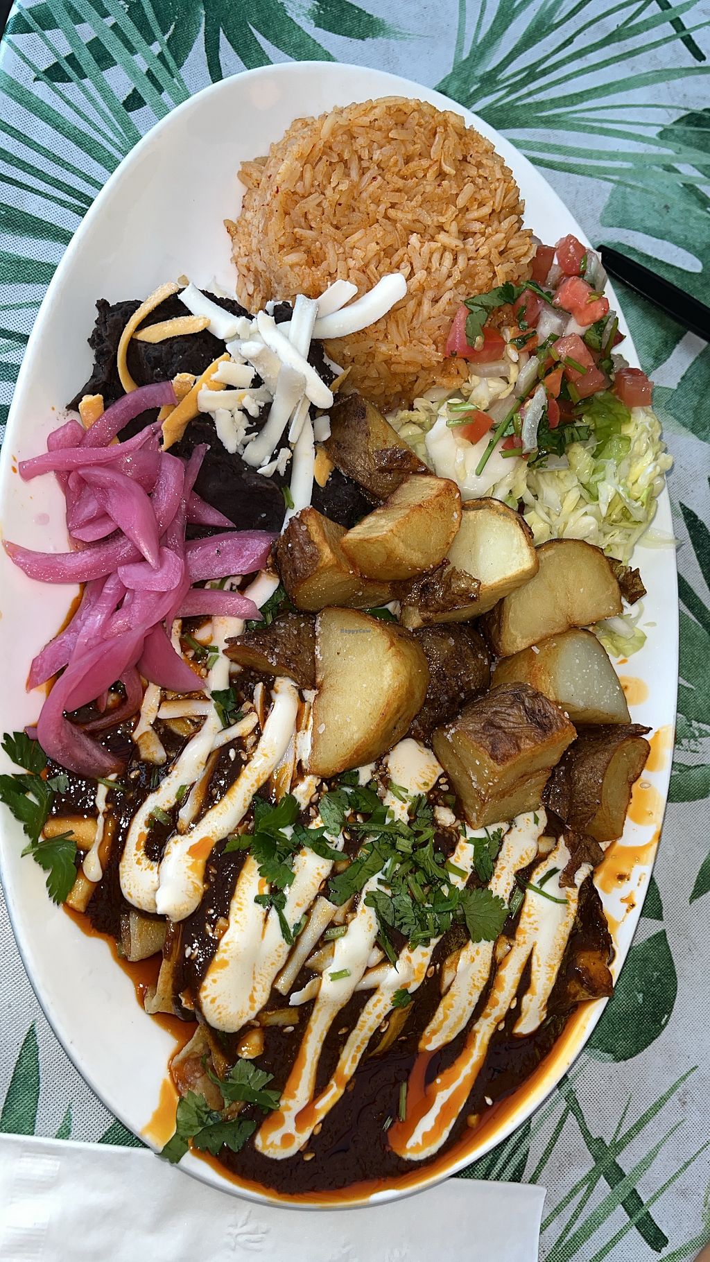 Entirely vegan Mexican food cart. We had the enmoladas, the chilaquiles, and horchata. All vegan and so delicious and filling! Super friendly service as well.