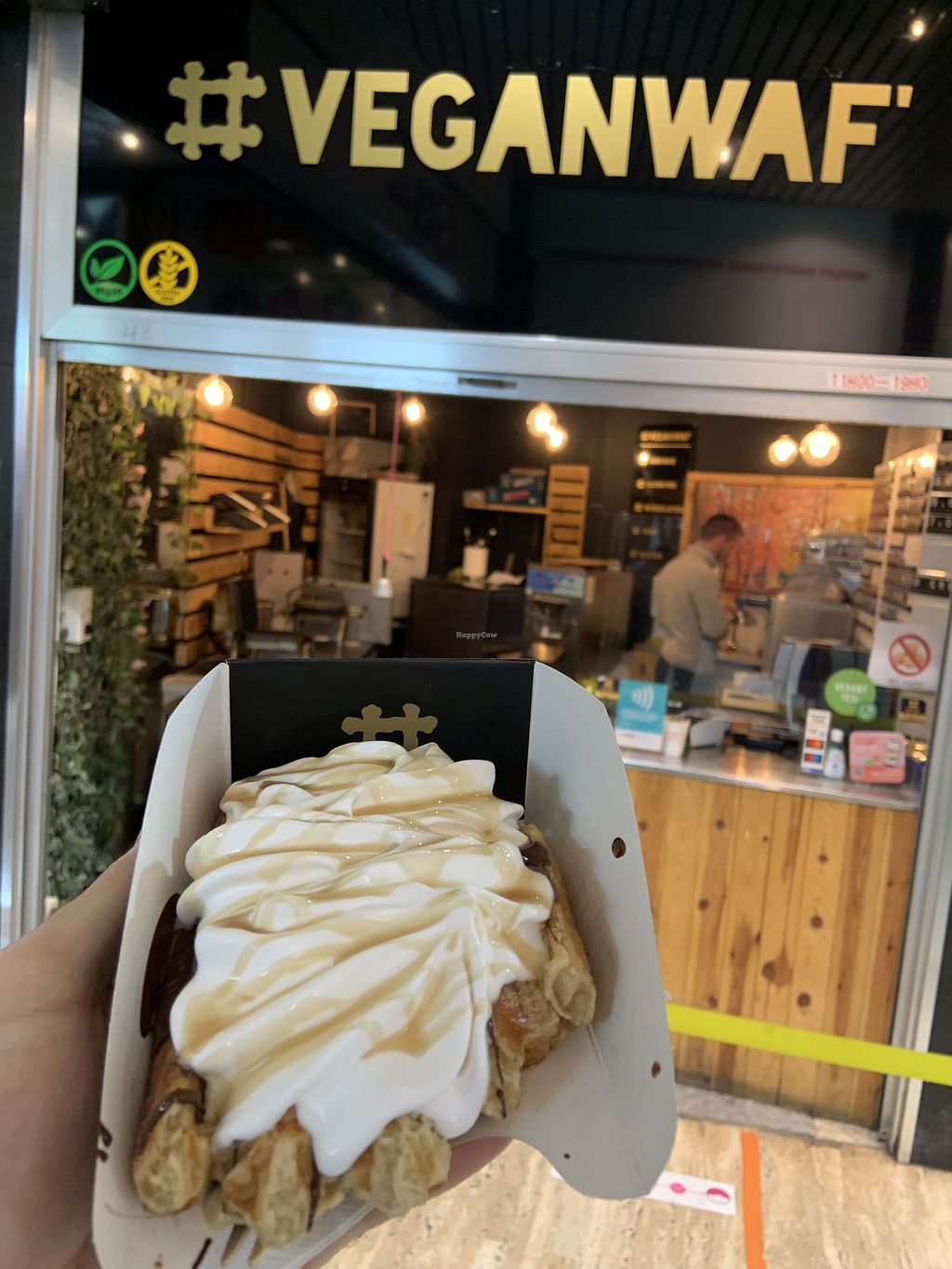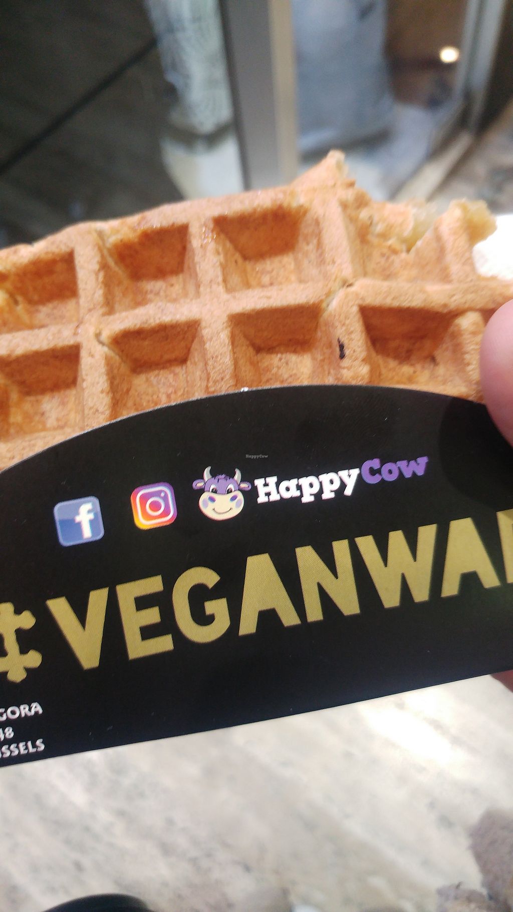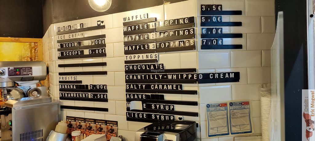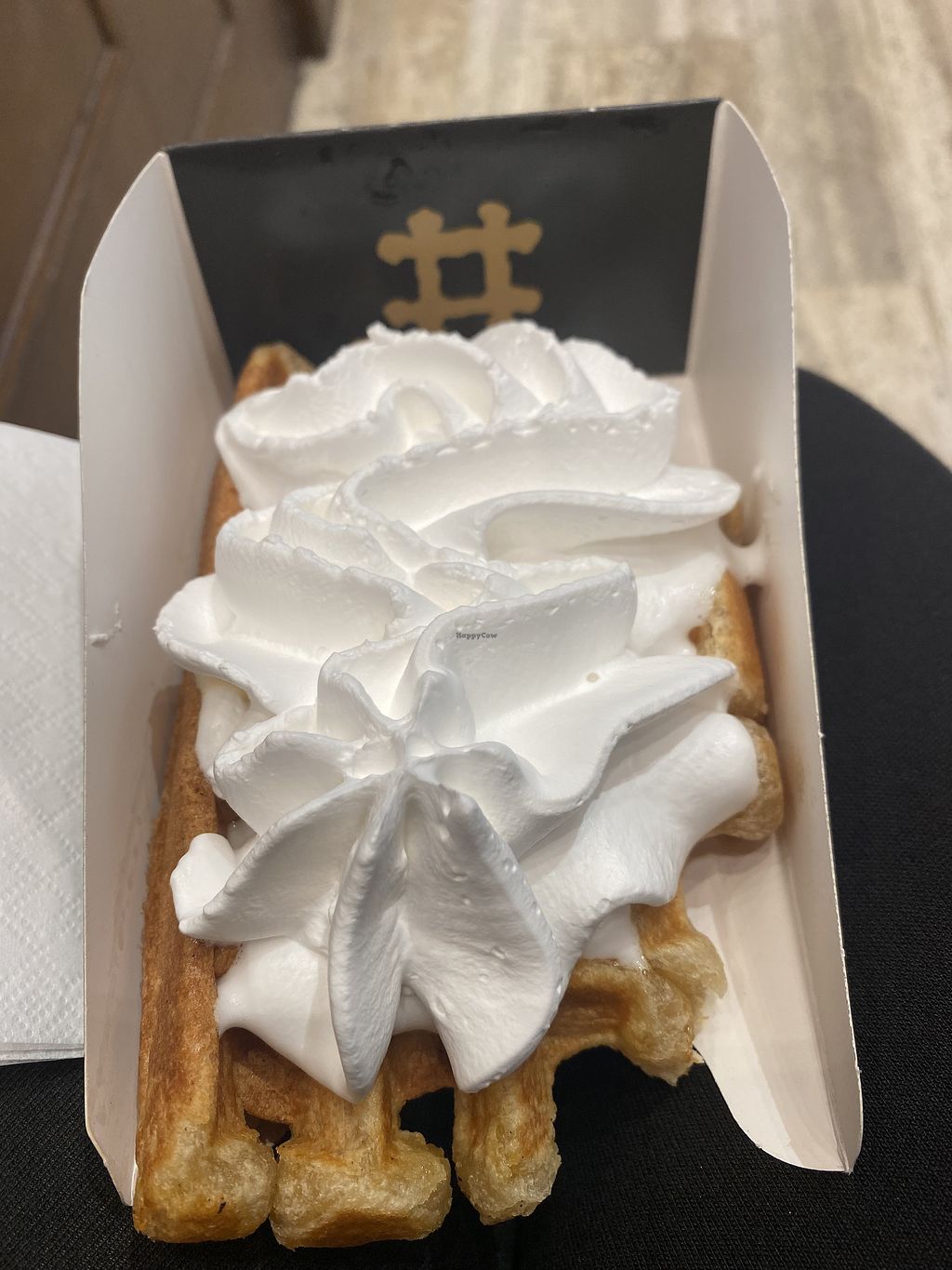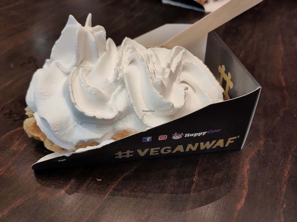 My waffle with banana and chantilly topping, NOTE HappyCOW Logo !!!!