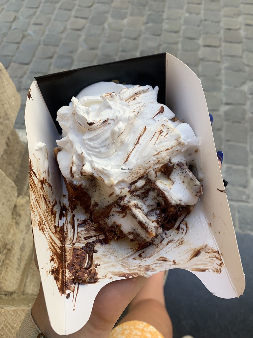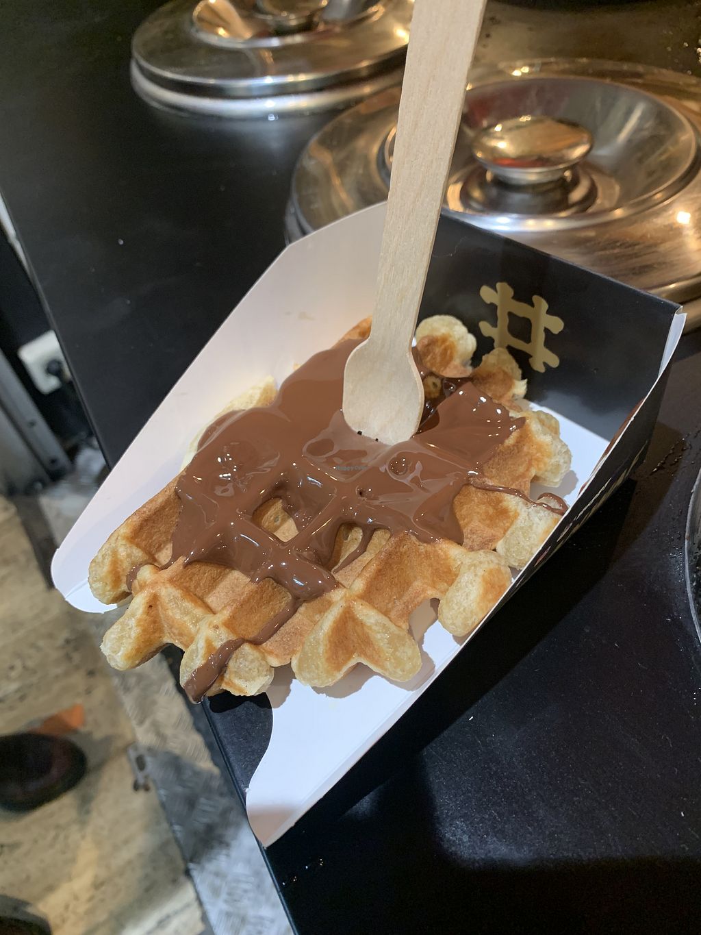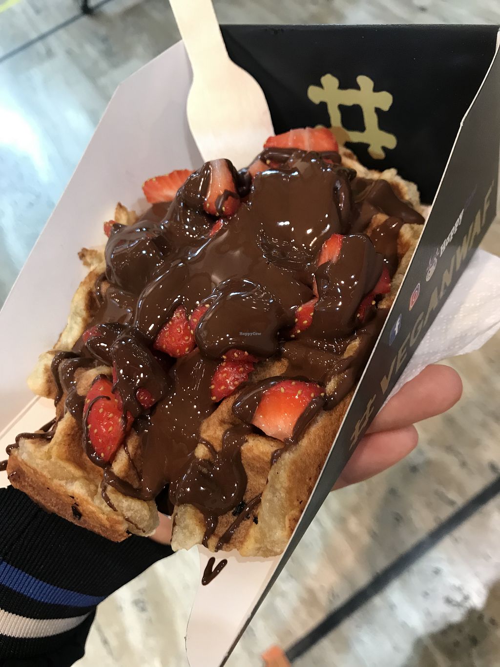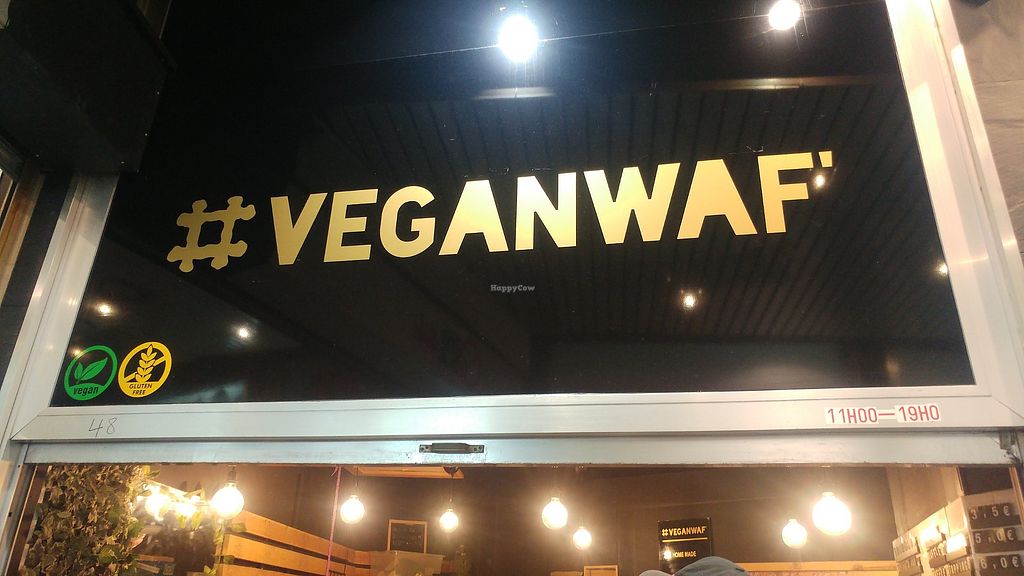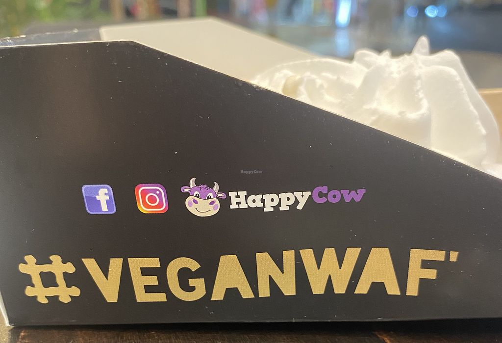 My waffle with banana and chantilly topping, NOTE HappyCOW Logo !!!!