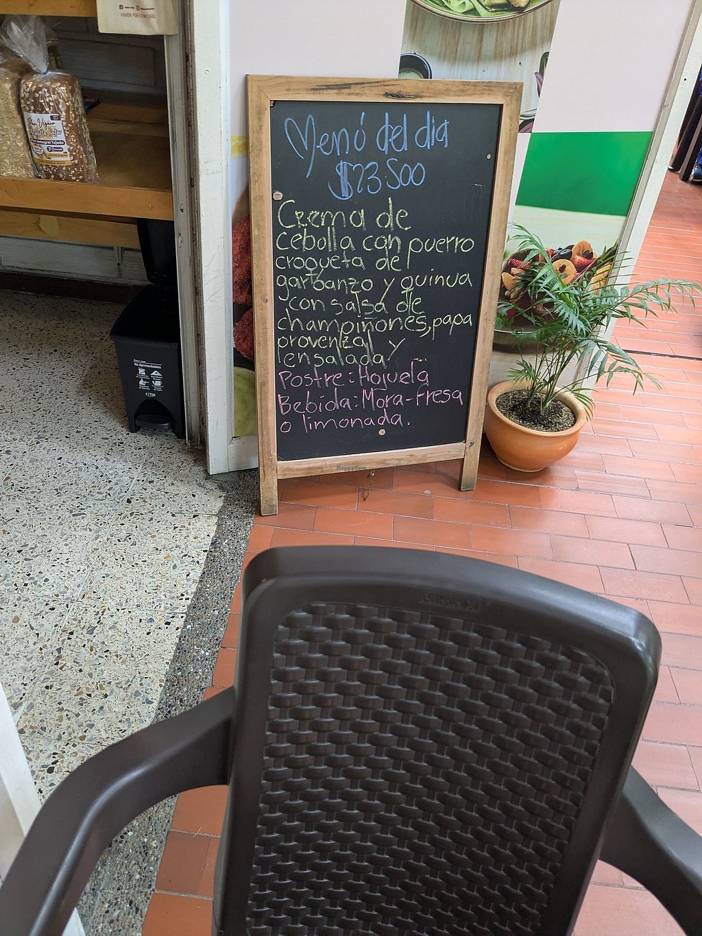 Meal of day: salad, potatoes, soup, garbanzo burger