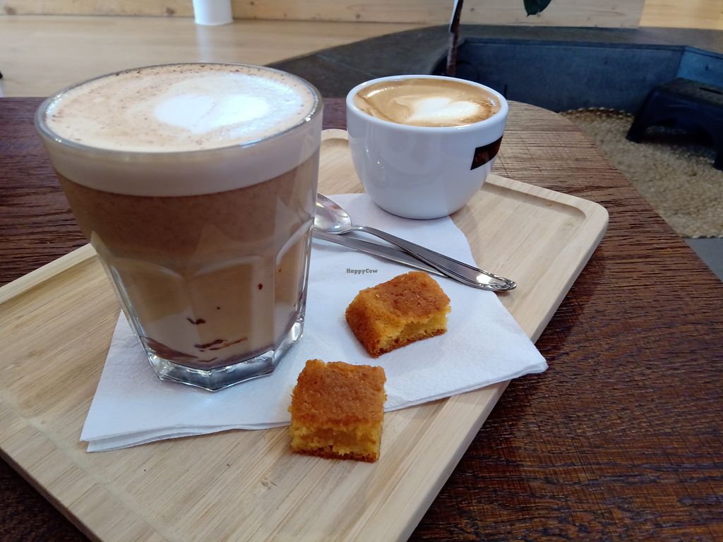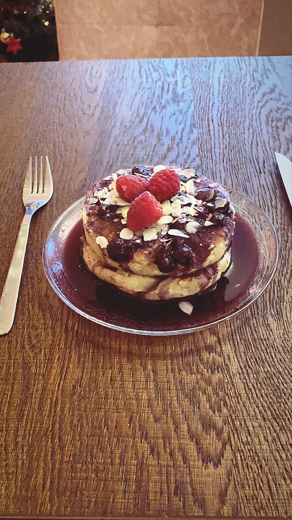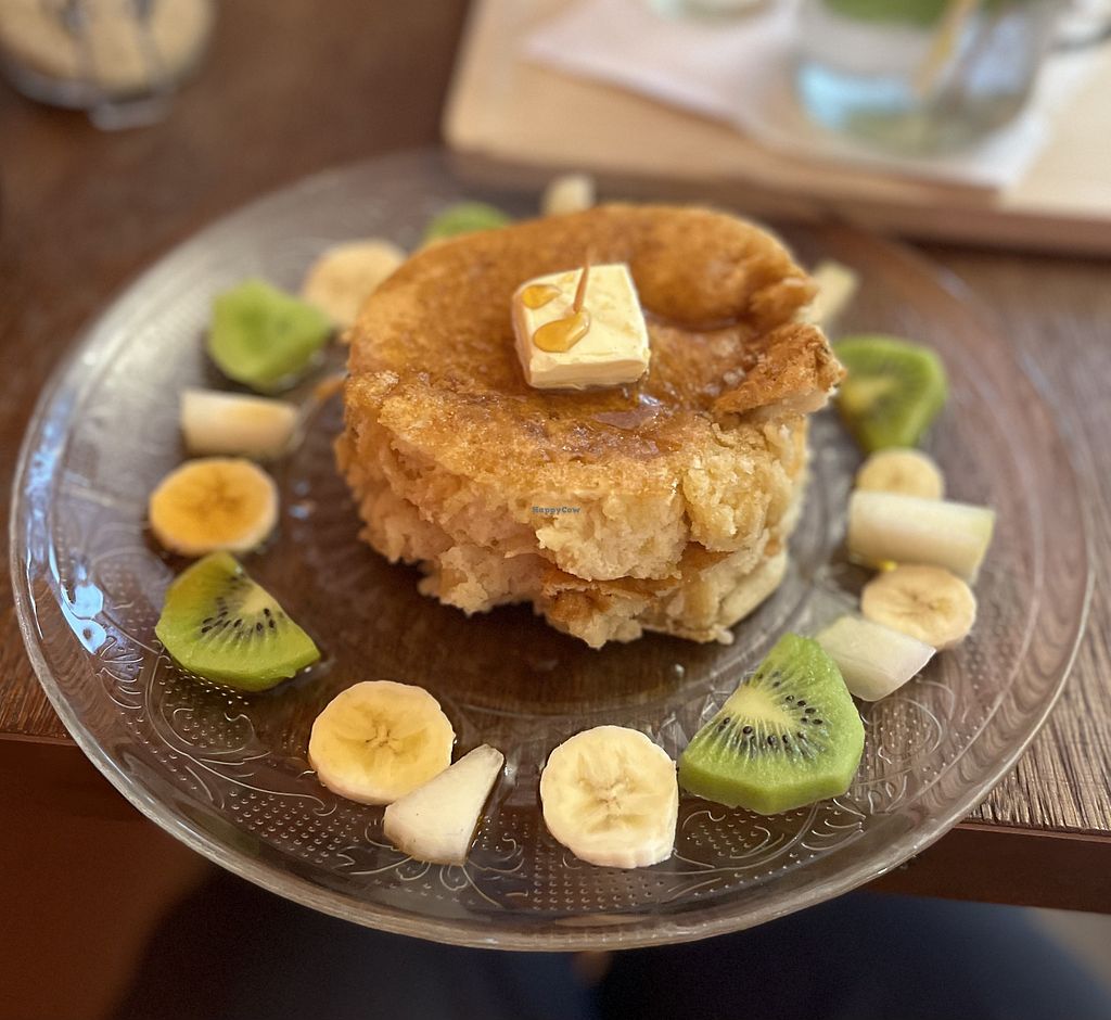 2 pancakes with maple syrup, vegan butter and fresh fruit