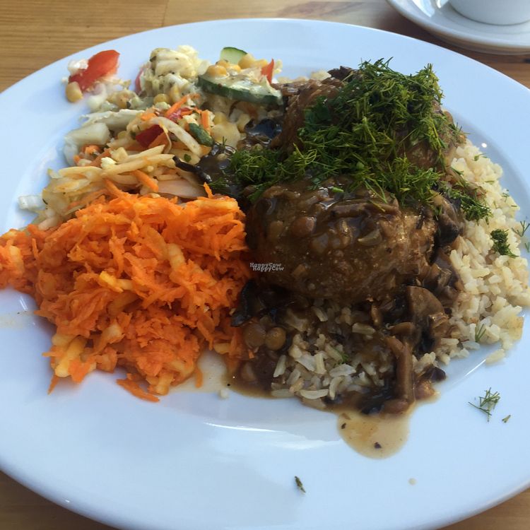 soya cutlets with mushroom sauce, salad and rice