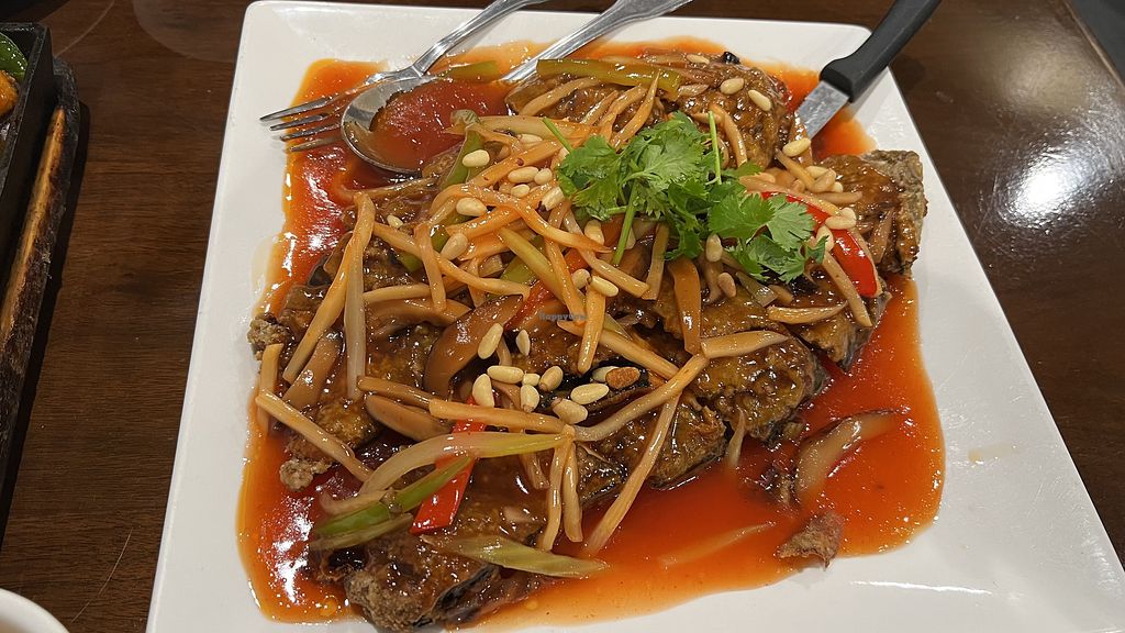 My family came here before, and loved it so much they made us drive 1 hour 10 through LA traffic to come again. All vegetarian (some contain eggs, clearly marked), mostly vegan. First class food. The best was the Vege Fish with Pine Nuts; but even the Chopped Mustard with Tofu Skin was excellent. The other tables were all filled with Chinese people - it looks popular.
