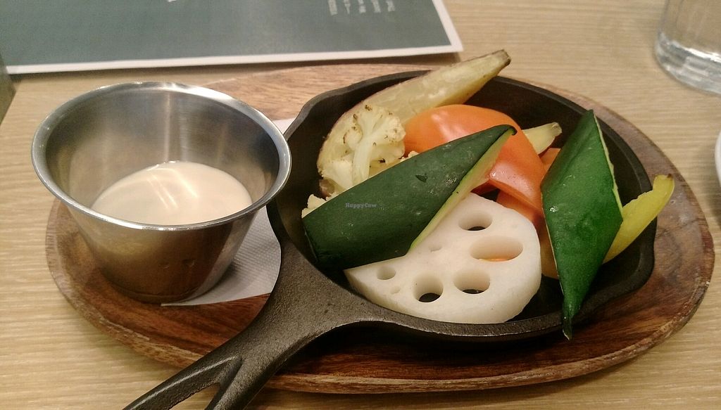 一進去表明我是素食者,服務人員好像蠻驚訝的,他馬上進去裡面問有沒有素食,後來他跟我說,可以點沙拉和温野菜,我點了温野菜,端上來的是小煎盤蔬菜和醬料,我問他們醬料是否有加魚,他們說有! 因此我要了醬油和鹽來配。
