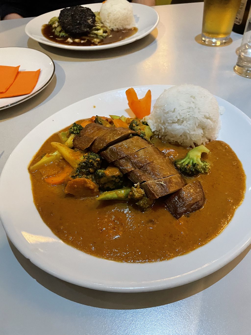 We love Asian food and they have a fantastic selection of dishes using faux meats and faux fish. Using Google lens to translate the menu we chose a sesame coated salmon in curry sauce, crispy duck with mushrooms and lamb with vegetables in five spice sauce. It came as a sharing platter so that we could easily pick and mix. Everyone else seemed to pick a dish and that came as a complete meal. The food was really tasty and we just about managed to eat it all. Definitely worth a visit if you are in Bremen.