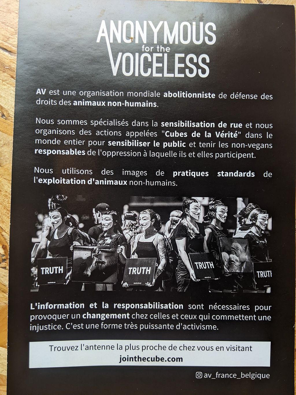 Advertisment for Anonymous for the Voiceless at Végéman