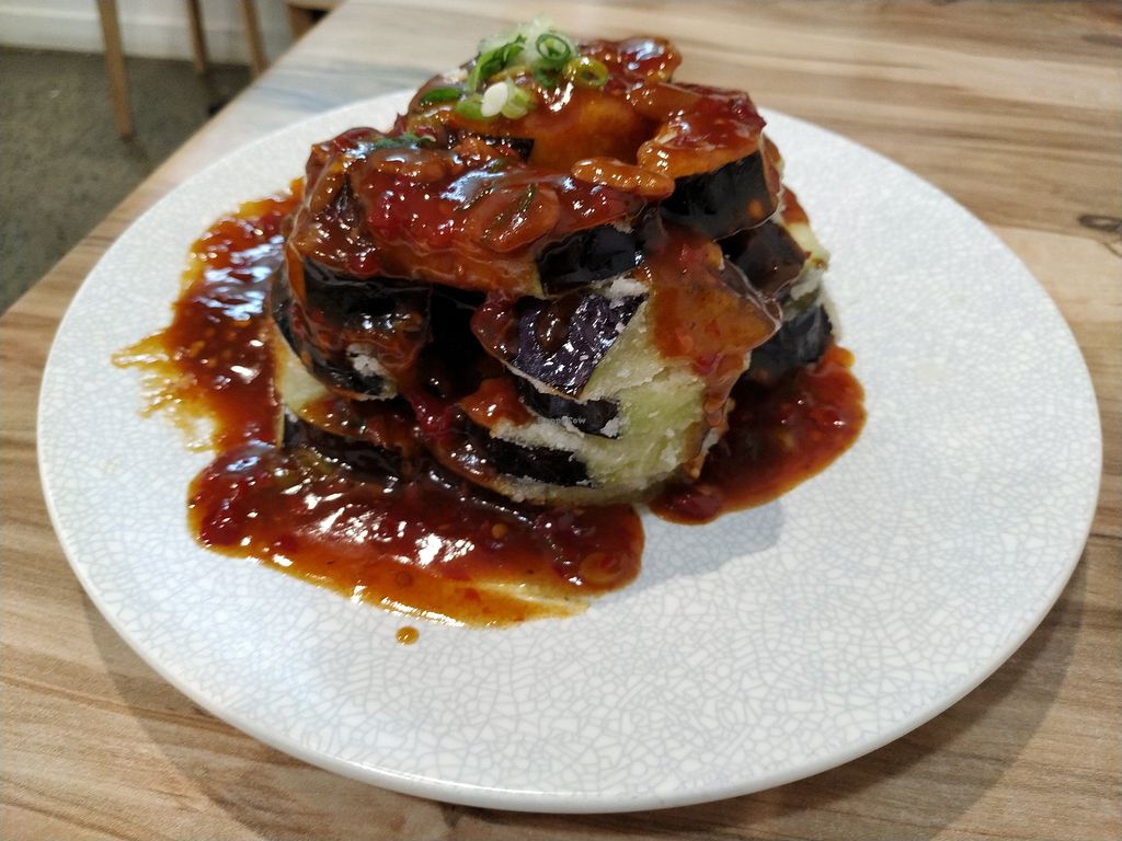We got some peanut and sesame balls and some dim sims for entrée, and sizzling "beef", spicy Szechuan eggplant, and the lemon "chicken" as well.