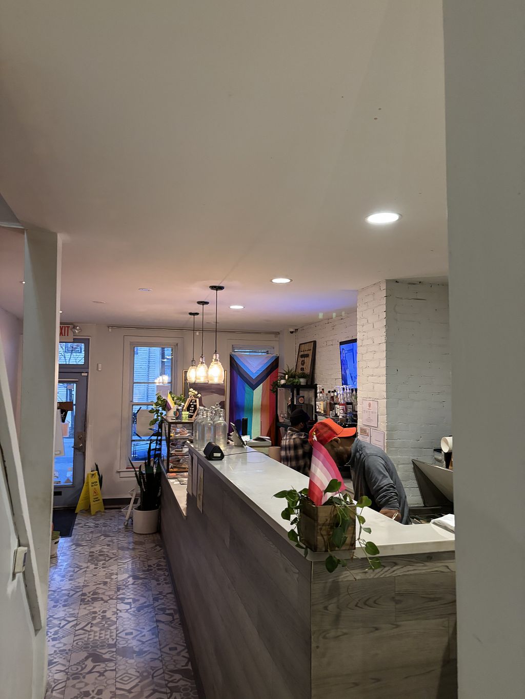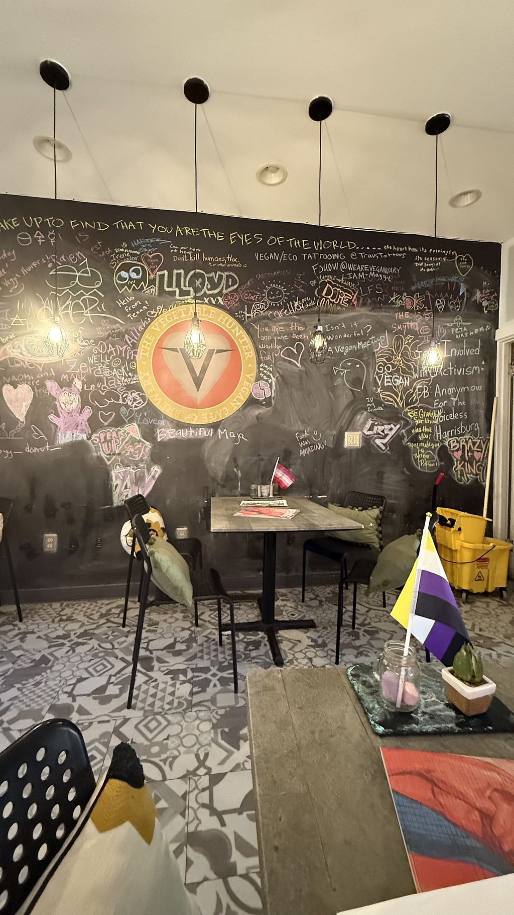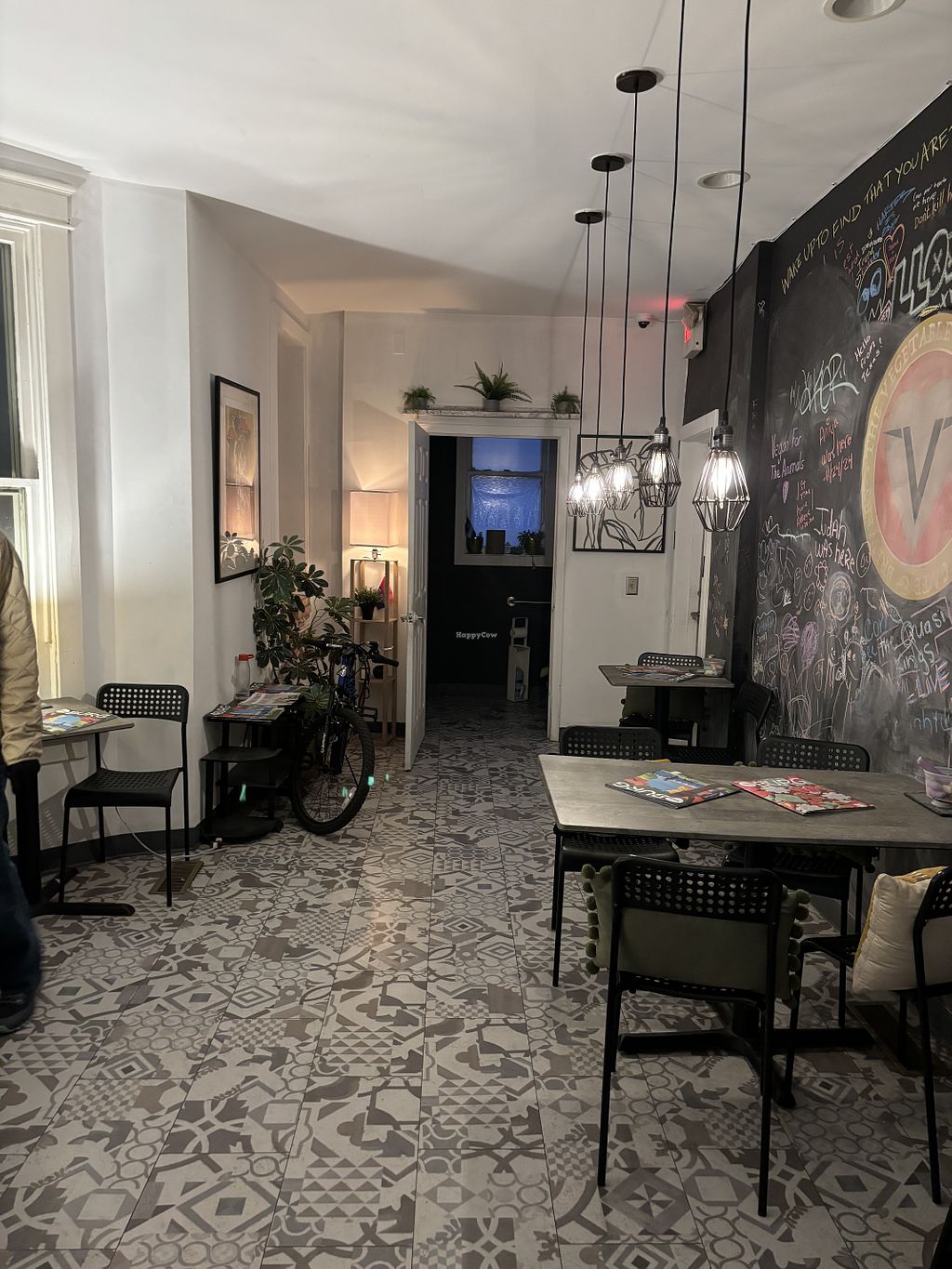 The vibe / atmosphere is cute and casual. Contemporary tiles on the floor, a chalkboard wall, and tables with local zines on them.