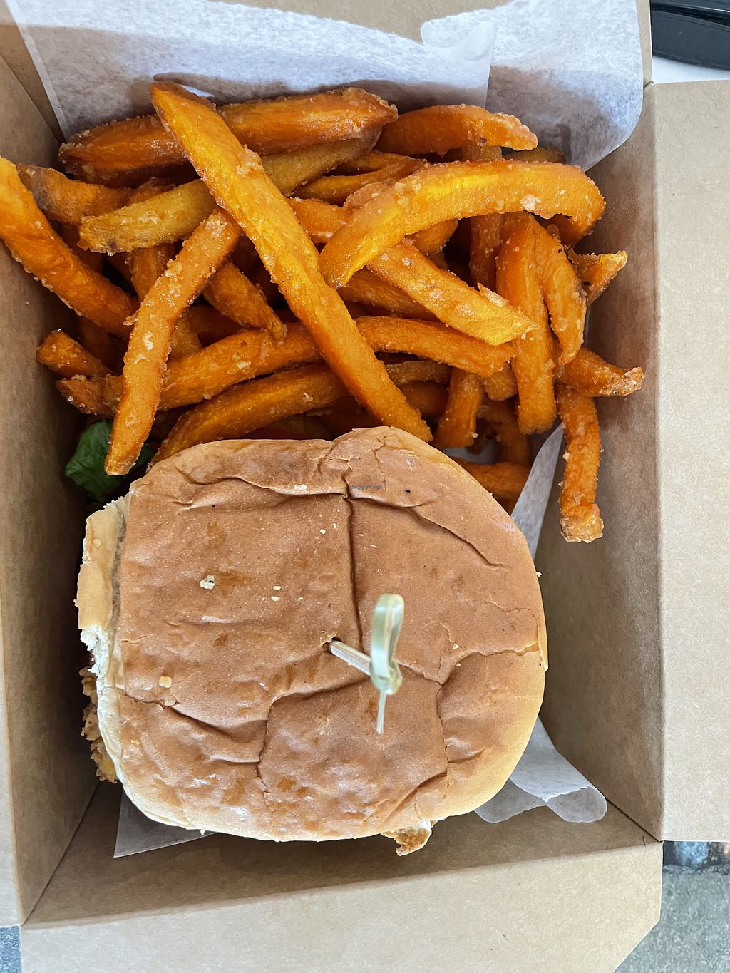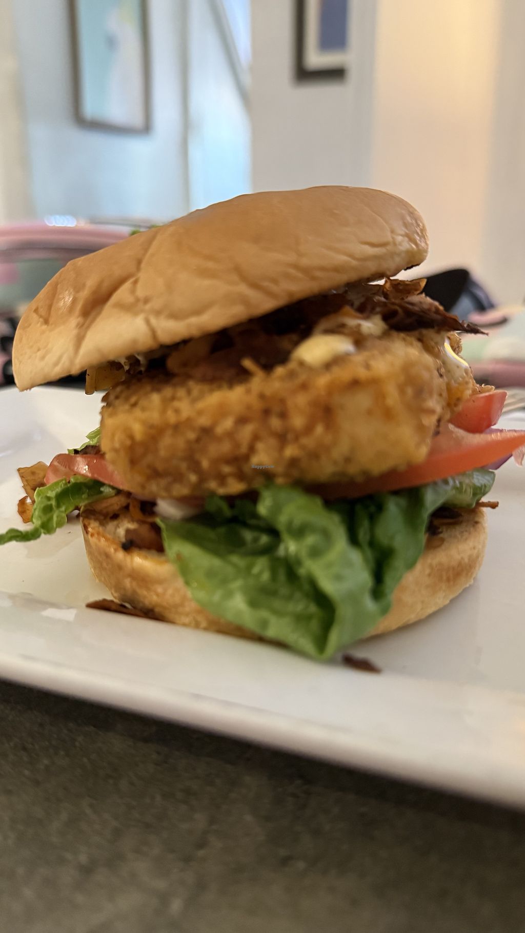 The sandwich is delicious and messy haha. Eating it with a fork made more sense than with my hands. The flavor is great! The texture of the tofu "chicken" and crunchy outside was perfect!