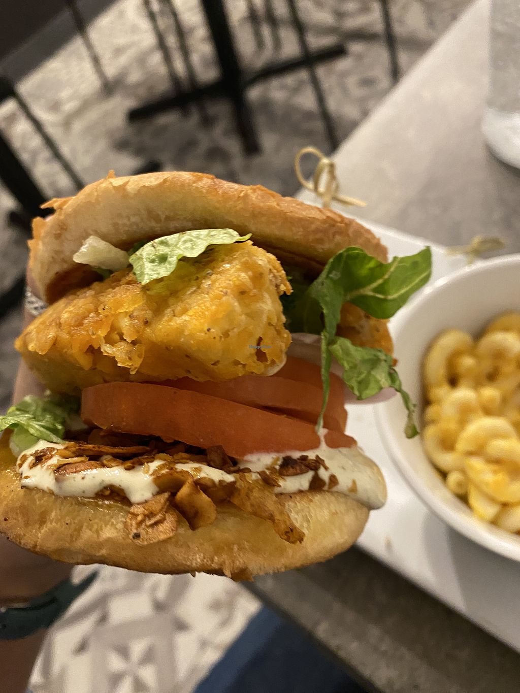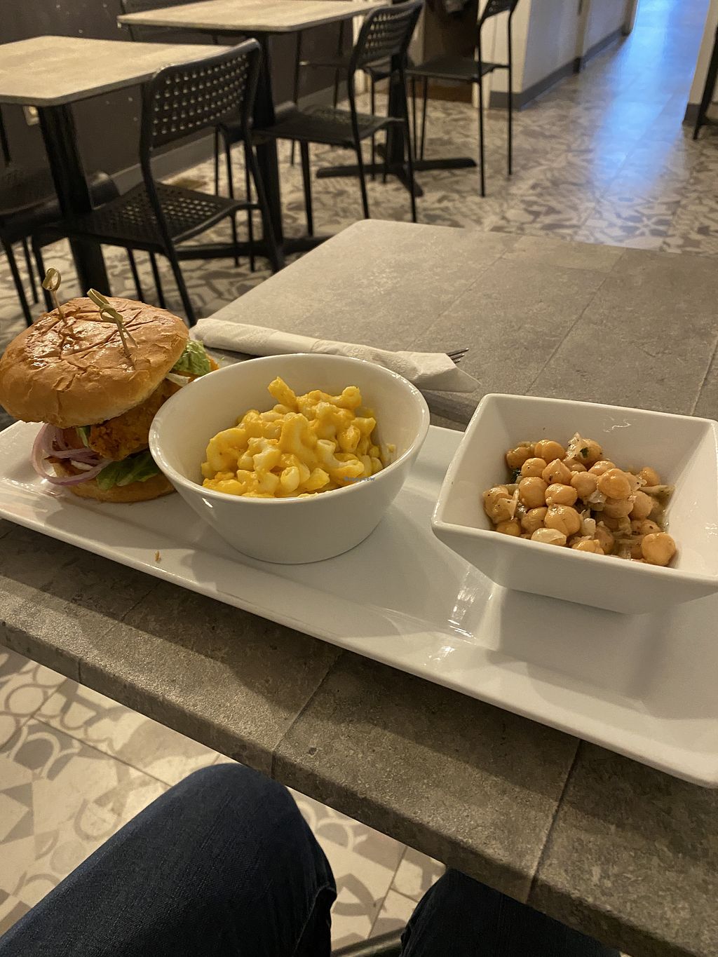 Buffalo bacon ranch chicken sandwich, Mac and cheese (extra $) and chi…