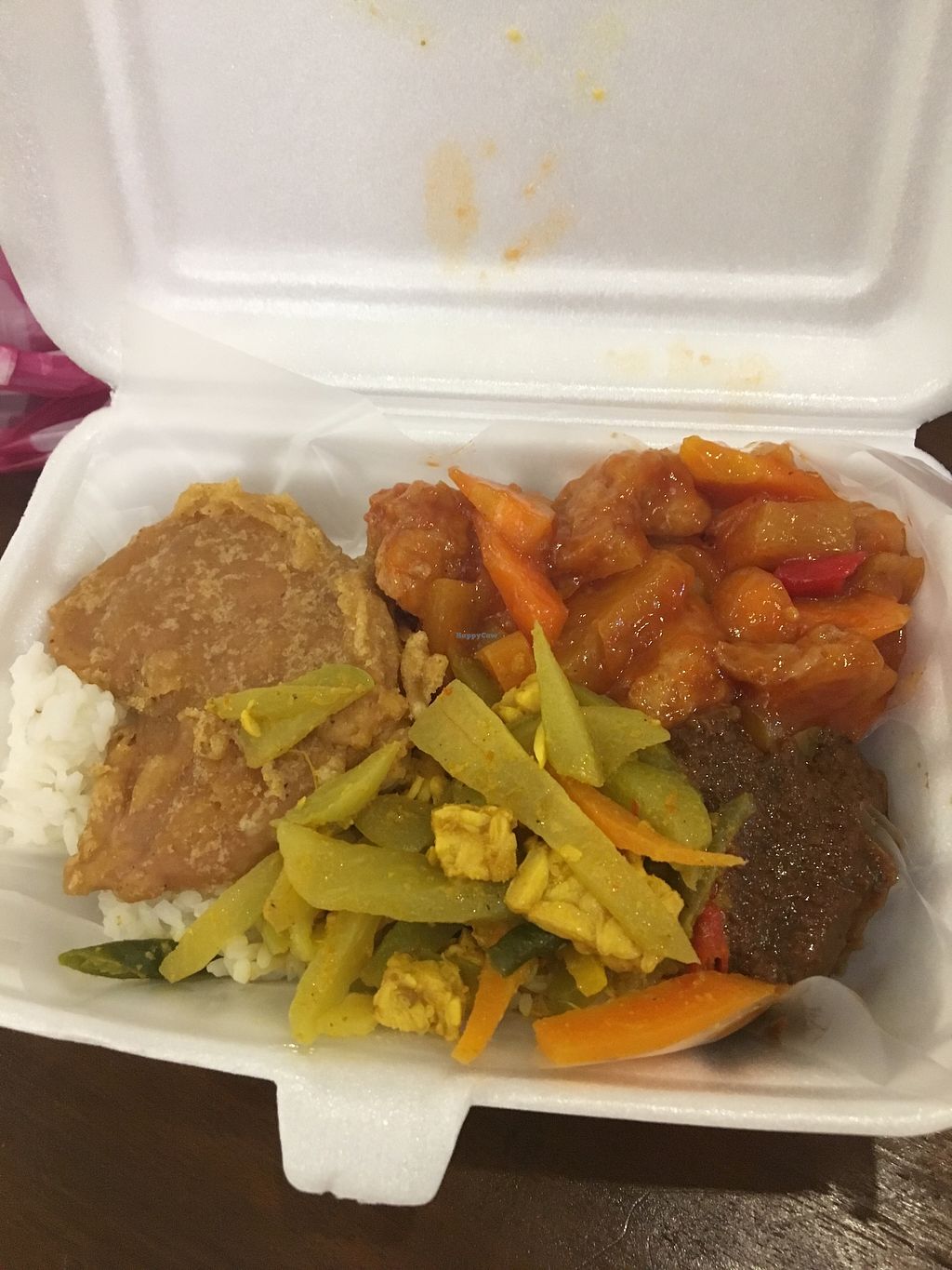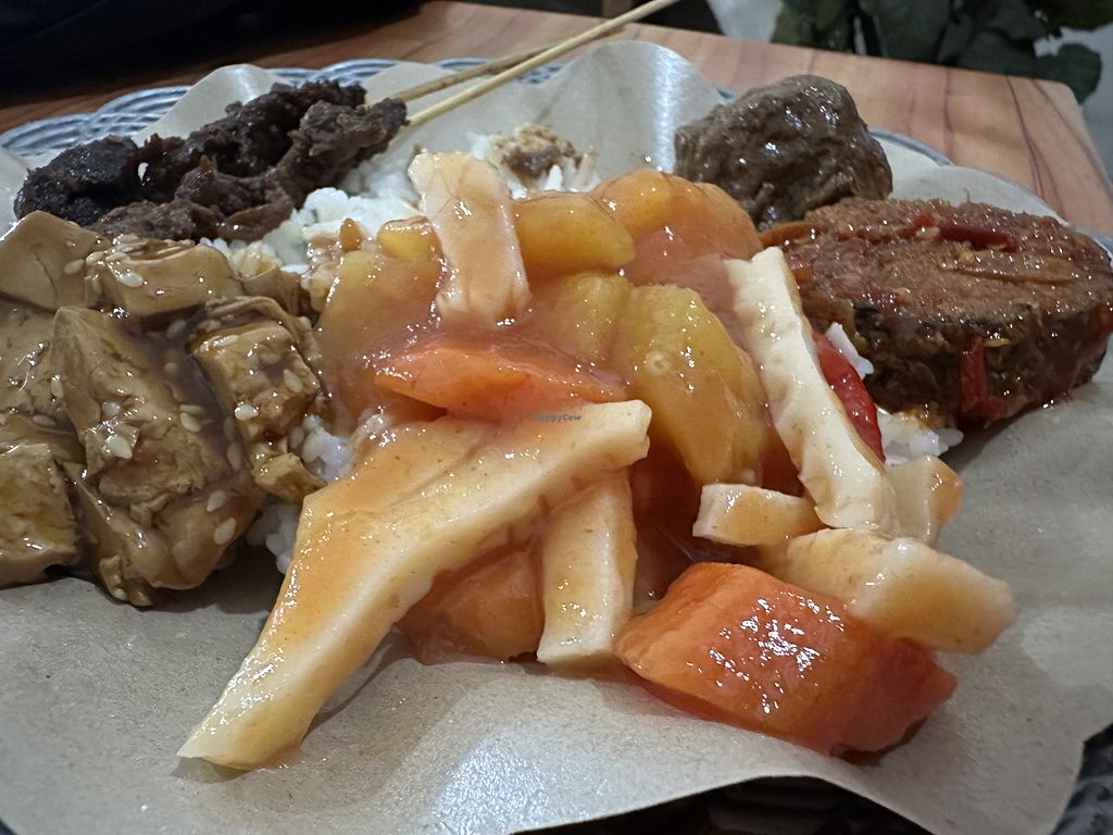 I got a big plate at a very good price (as the owner will tell you, he's upfront about his prices). I was also given a complimentary cup of tea. The food was quite good on a large serving of rice, and had a nice variety of veg and mock meat. Red mock pork and satay skewers were a personal favorite. Filling and delicious.