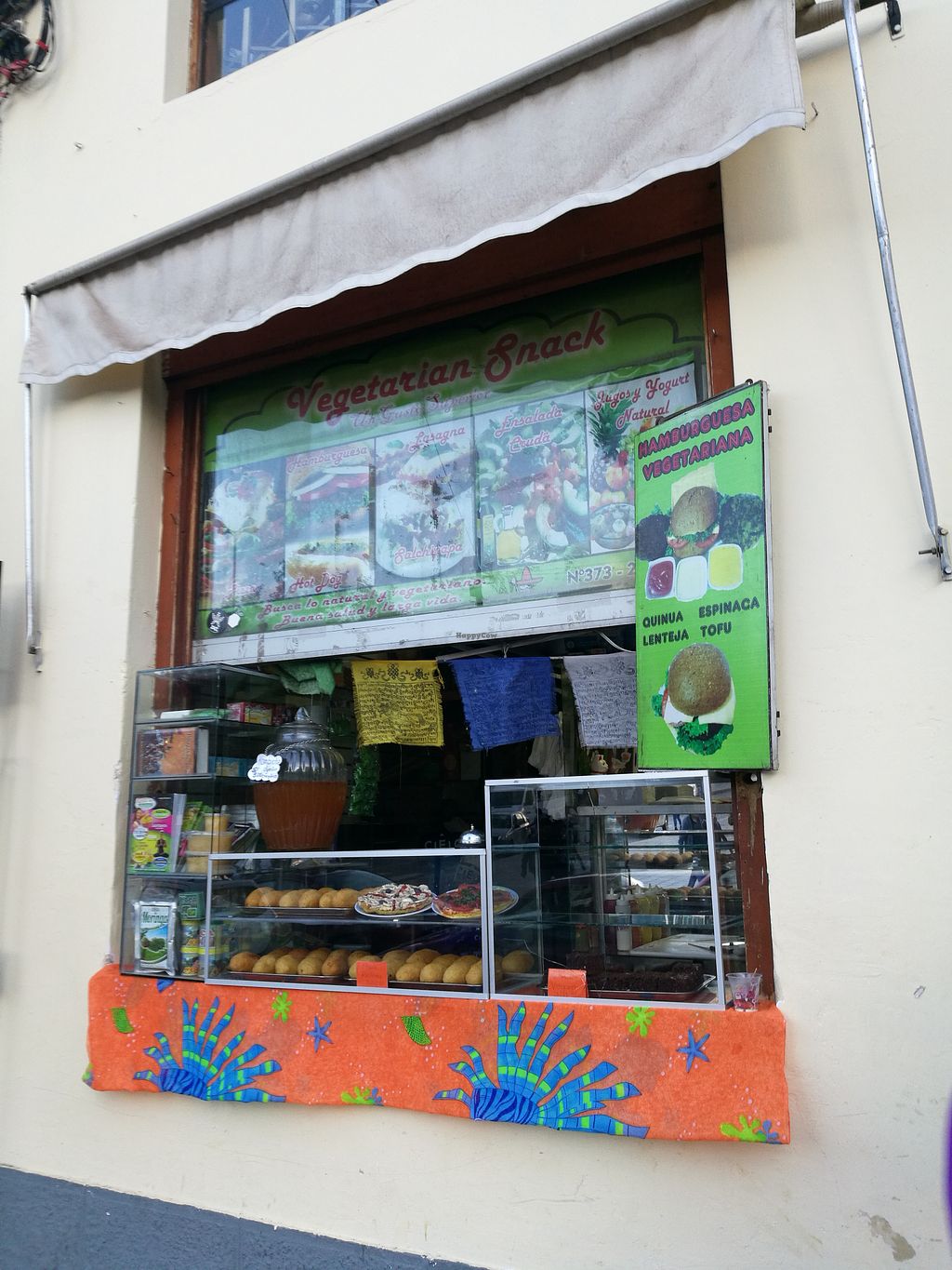 Window of snacks next to a Vrinda store.