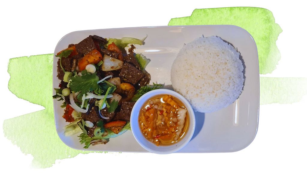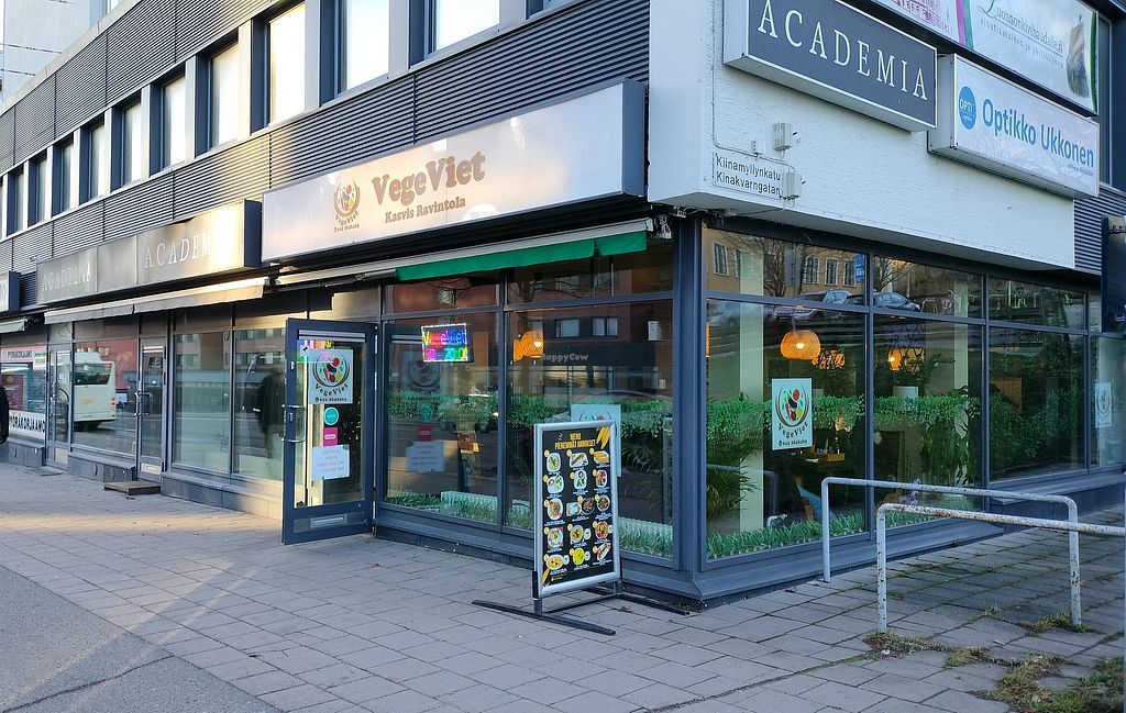 Vegetarian restaurant serving Vietnamese cuisine with a clearly labeled menu. Example vegan offerings include green curry, pho, noodle stir fry, fried rice, and more. Open Mon-Fri 10:30-20:00, Sat-Sun 12:00-20:00.