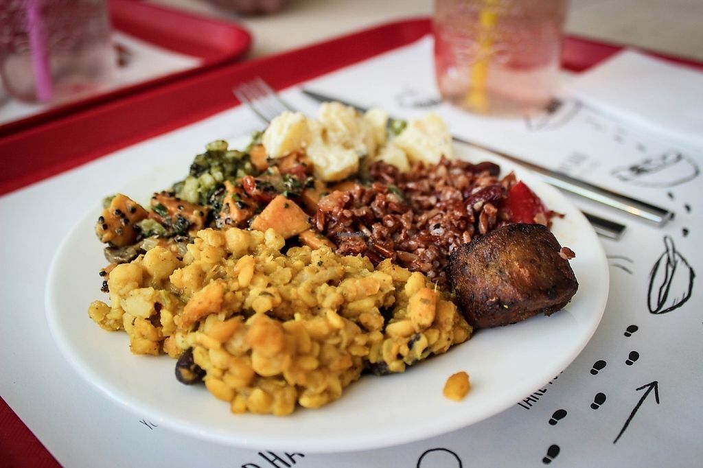This restaurant is sooooo nice ! It's on self-service, and you pay depending on the weight of your plate. It's not expensive at all. Everything is vegan except for some sweets (cake, muffin).