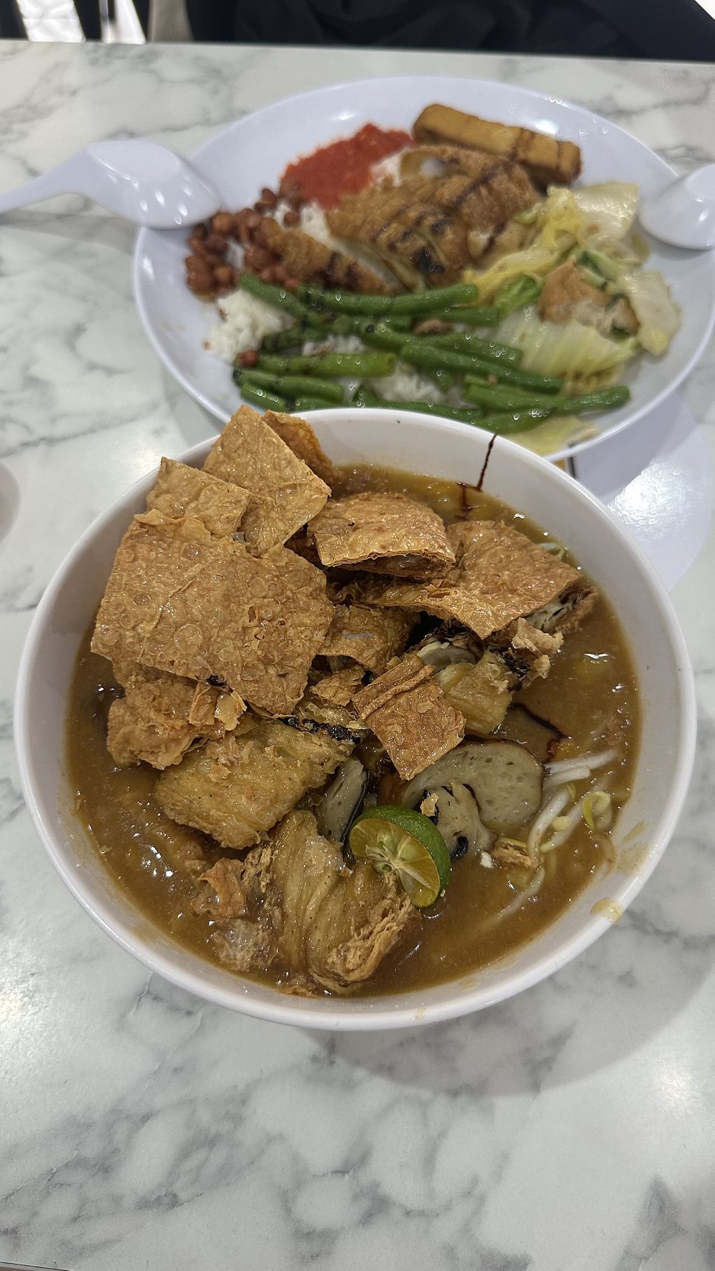 Chose brown rice, two vegetables, two mock meats and curry sauce