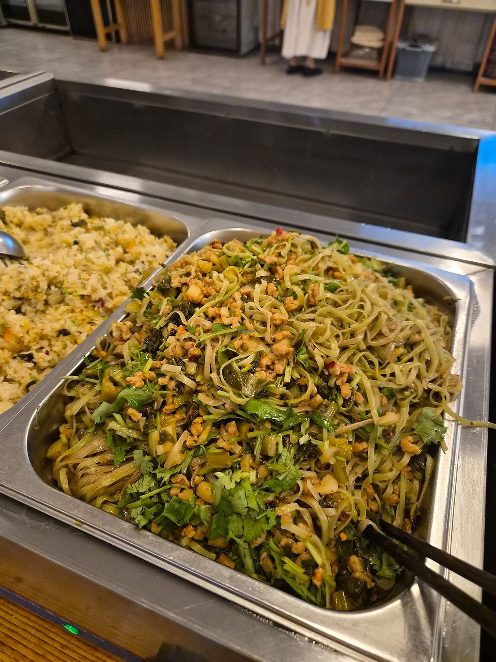 When you go to this place, there is an yard with different shops. Go on the left until you see the reception. Pay 35yuan per person and get a voucher. Go to the right corner of the room and find the buffet. Pizza, coffee, soups, rice, noodles, veggies, you can eat until your exploding😉was the best price-value for us in Dali.