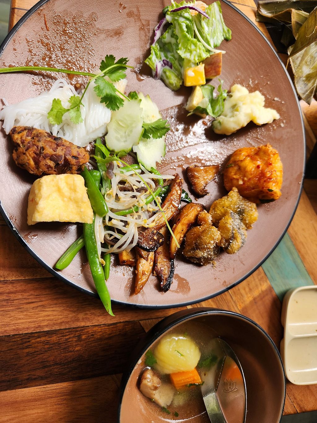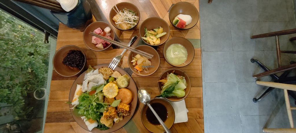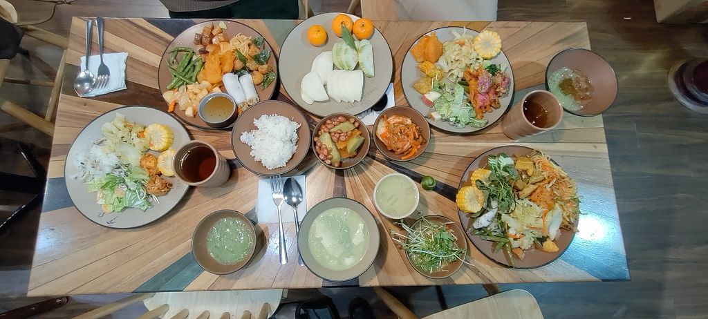 It's very tasty and so eclectic that one cannot be disappointed : various salads (with or without fruits), several kinds of tofu dishes (savoury or sweet), desserts, fried, steamed, stir fried, boiled food, soups, fresh vegetables, spring rolls, noodles, black and white rice, sweet potatoes, potatoes, various kinds of noodles, various sauces, mushrooms, and so on.